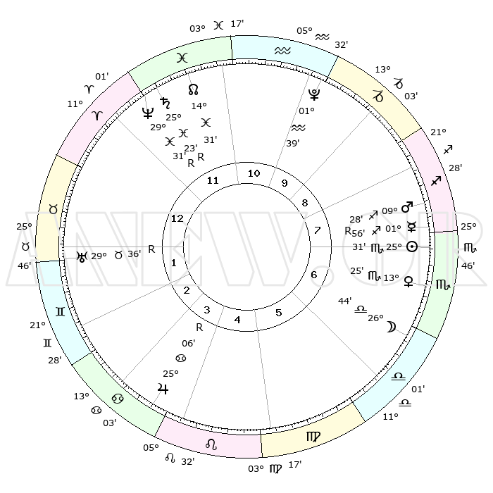 | | ΘΕΣΕΙΣ ΠΛΑΝΗΤΩΝ ΑΣΤΡΟΛΟΓΙΚΟΥ ΧΑΡΤΗ ΤΗΣ ΣΤΙΓΜΗΣ ΑΥΤΗΣ | | | | Πλανήτης | Ζώδιο | Μοίρες | Δεκαήμ. | Σε οίκο | Απόκλιση | | Ακμές των οίκων | | Ηλιος | Σκορπιός | 25°26' | Τρίτο | 8 | 19 S 07 | | 1ος | 07°26' | Κριός | | Σελήνη | Ζυγός | 25°38' | Τρίτο | 7 | 12 S 54 | | 2ος | 15°51' | Ταύρος | | Ερμής | Τοξότης | 02°02'R | Πρώτο | 8 | 20 S 59 | | 3ος | 12°09' | Δίδυμοι | | Αφροδίτη | Σκορπιός | 13°18' | Δεύτερο | 7 | 14 S 44 | | 4ος | 04°10' | Καρκίνος | | Αρης | Τοξότης | 09°24' | Πρώτο | 8 | 22 S 24 | | 5ος | 26°51' | Καρκίνος | | Δίας | Καρκίνος | 25°06'R | Τρίτο | 4 | 21 N 14 | | 6ος | 25°26' | Λέων | | Κρόνος | Ιχθείς | 25°23'R | Τρίτο | 12 | 04 S 03 | | 7ος | 07°26' | Ζυγός | | Ουρανός | Ταύρος | 29°36'R | Τρίτο | 2 | 19 N 51 | | 8ος | 15°51' | Σκορπιός | | Ποσειδώνας | Ιχθείς | 29°31'R | Τρίτο | 12 | 01 S 26 | | 9ος | 12°09' | Τοξότης | | Πλούτωνας | Υδροχόος | 01°39' | Πρώτο | 11 | 23 S 28 | | 10ος | 04°11' | Αιγόκερως | | Β. Δεσμός | Ιχθείς | 14°31' | Δεύτερο | 12 | 06 S 05 | | 11ος | 26°51' | Αιγόκερως | | Ωροσκόπος | Κριός | 07°26' | Πρώτο | | | 12ος | 25°26' | Υδροχόος | | Μεσουράνημα | Αιγόκερως | 04°11' | Πρώτο | | | |