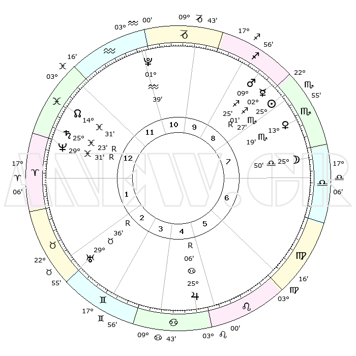 | | ΘΕΣΕΙΣ ΠΛΑΝΗΤΩΝ ΑΣΤΡΟΛΟΓΙΚΟΥ ΧΑΡΤΗ ΤΗΣ ΣΤΙΓΜΗΣ ΑΥΤΗΣ | | | | Πλανήτης | Ζώδιο | Μοίρες | Δεκαήμ. | Σε οίκο | Απόκλιση | | Ακμές των οίκων | | Ηλιος | Σκορπιός | 25°23' | Τρίτο | 9 | 19 S 06 | | 1ος | 06°44' | Ιχθείς | | Σελήνη | Ζυγός | 25°00' | Τρίτο | 8 | 12 S 38 | | 2ος | 21°27' | Κριός | | Ερμής | Τοξότης | 02°06'R | Πρώτο | 9 | 21 S 01 | | 3ος | 22°52' | Ταύρος | | Αφροδίτη | Σκορπιός | 13°14' | Δεύτερο | 8 | 14 S 43 | | 4ος | 16°39' | Δίδυμοι | | Αρης | Τοξότης | 09°22' | Πρώτο | 9 | 22 S 23 | | 5ος | 08°21' | Καρκίνος | | Δίας | Καρκίνος | 25°06'R | Τρίτο | 5 | 21 N 14 | | 6ος | 02°38' | Λέων | | Κρόνος | Ιχθείς | 25°23'R | Τρίτο | 1 | 04 S 03 | | 7ος | 06°43' | Παρθένος | | Ουρανός | Ταύρος | 29°36'R | Τρίτο | 3 | 19 N 52 | | 8ος | 21°27' | Ζυγός | | Ποσειδώνας | Ιχθείς | 29°31'R | Τρίτο | 1 | 01 S 26 | | 9ος | 22°52' | Σκορπιός | | Πλούτωνας | Υδροχόος | 01°39' | Πρώτο | 11 | 23 S 28 | | 10ος | 16°39' | Τοξότης | | Β. Δεσμός | Ιχθείς | 14°32' | Δεύτερο | 1 | 06 S 05 | | 11ος | 08°21' | Αιγόκερως | | Ωροσκόπος | Ιχθείς | 06°44' | Πρώτο | | | 12ος | 02°38' | Υδροχόος | | Μεσουράνημα | Τοξότης | 16°39' | Δεύτερο | | | |