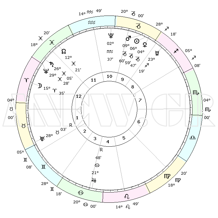 | | ΘΕΣΕΙΣ ΠΛΑΝΗΤΩΝ ΑΣΤΡΟΛΟΓΙΚΟΥ ΧΑΡΤΗ ΤΗΣ ΣΤΙΓΜΗΣ ΑΥΤΗΣ | | | | Πλανήτης | Ζώδιο | Μοίρες | Δεκαήμ. | Σε οίκο | Απόκλιση | | Ακμές των οίκων | | Ηλιος | Αιγόκερως | 06°54' | Πρώτο | 10 | 23 S 15 | | 1ος | 16°42' | Ιχθείς | | Σελήνη | Κριός | 14°26' | Δεύτερο | 1 | 08 N 15 | | 2ος | 29°52' | Κριός | | Ερμής | Τοξότης | 23°12' | Τρίτο | 10 | 23 S 25 | | 3ος | 29°27' | Ταύρος | | Αφροδίτη | Αιγόκερως | 04°41' | Πρώτο | 10 | 23 S 43 | | 4ος | 22°29' | Δίδυμοι | | Αρης | Αιγόκερως | 09°56' | Πρώτο | 10 | 23 S 56 | | 5ος | 14°20' | Καρκίνος | | Δίας | Καρκίνος | 21°49'R | Τρίτο | 5 | 21 N 54 | | 6ος | 09°51' | Λέων | | Κρόνος | Ιχθείς | 26°05' | Τρίτο | 1 | 03 S 38 | | 7ος | 16°42' | Παρθένος | | Ουρανός | Ταύρος | 28°03'R | Τρίτο | 2 | 19 N 32 | | 8ος | 29°52' | Ζυγός | | Ποσειδώνας | Ιχθείς | 29°28' | Τρίτο | 1 | 01 S 26 | | 9ος | 29°27' | Σκορπιός | | Πλούτωνας | Υδροχόος | 02°37' | Πρώτο | 11 | 23 S 15 | | 10ος | 22°29' | Τοξότης | | Β. Δεσμός | Ιχθείς | 12°22' | Δεύτερο | 12 | 06 S 55 | | 11ος | 14°20' | Αιγόκερως | | Ωροσκόπος | Ιχθείς | 16°42' | Δεύτερο | | | 12ος | 09°51' | Υδροχόος | | Μεσουράνημα | Τοξότης | 22°29' | Τρίτο | | | |