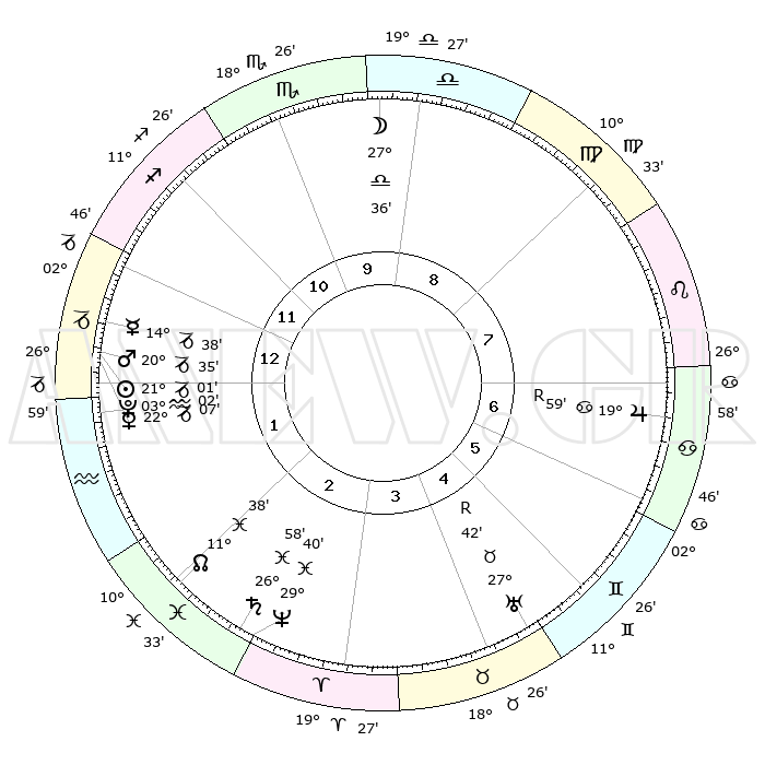 | | ΘΕΣΕΙΣ ΠΛΑΝΗΤΩΝ ΑΣΤΡΟΛΟΓΙΚΟΥ ΧΑΡΤΗ ΤΗΣ ΣΤΙΓΜΗΣ ΑΥΤΗΣ | | | | Πλανήτης | Ζώδιο | Μοίρες | Δεκαήμ. | Σε οίκο | Απόκλιση | | Ακμές των οίκων | | Ηλιος | Αιγόκερως | 20°29' | Τρίτο | 6 | 21 S 52 | | 1ος | 14°37' | Λέων | | Σελήνη | Ζυγός | 21°11' | Τρίτο | 3 | 11 S 22 | | 2ος | 06°53' | Παρθένος | | Ερμής | Αιγόκερως | 13°47' | Δεύτερο | 5 | 24 S 12 | | 3ος | 03°53' | Ζυγός | | Αφροδίτη | Αιγόκερως | 21°27' | Τρίτο | 6 | 22 S 34 | | 4ος | 06°17' | Σκορπιός | | Αρης | Αιγόκερως | 20°11' | Τρίτο | 6 | 22 S 51 | | 5ος | 11°35' | Τοξότης | | Δίας | Καρκίνος | 20°03'R | Τρίτο | 12 | 22 N 12 | | 6ος | 15°07' | Αιγόκερως | | Κρόνος | Ιχθείς | 26°55' | Τρίτο | 8 | 03 S 16 | | 7ος | 14°37' | Υδροχόος | | Ουρανός | Ταύρος | 27°43'R | Τρίτο | 10 | 19 N 27 | | 8ος | 06°53' | Ιχθείς | | Ποσειδώνας | Ιχθείς | 29°39' | Τρίτο | 8 | 01 S 21 | | 9ος | 03°53' | Κριός | | Πλούτωνας | Υδροχόος | 03°01' | Πρώτο | 6 | 23 S 09 | | 10ος | 06°16' | Ταύρος | | Β. Δεσμός | Ιχθείς | 11°39' | Δεύτερο | 8 | 07 S 11 | | 11ος | 11°35' | Δίδυμοι | | Ωροσκόπος | Λέων | 14°37' | Δεύτερο | | | 12ος | 15°07' | Καρκίνος | | Μεσουράνημα | Ταύρος | 06°16' | Πρώτο | | | |