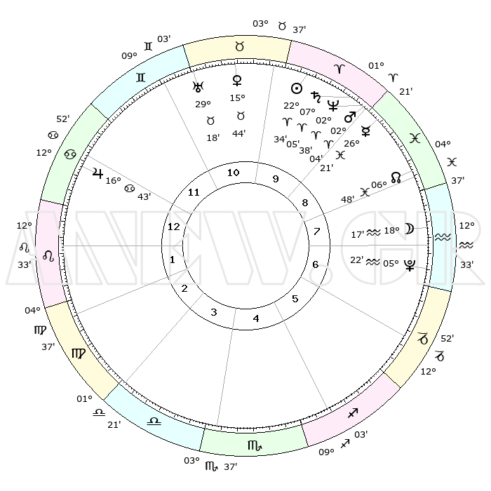 | | ΘΕΣΕΙΣ ΠΛΑΝΗΤΩΝ ΑΣΤΡΟΛΟΓΙΚΟΥ ΧΑΡΤΗ ΤΗΣ ΣΤΙΓΜΗΣ ΑΥΤΗΣ | | | | Πλανήτης | Ζώδιο | Μοίρες | Δεκαήμ. | Σε οίκο | Απόκλιση | | Ακμές των οίκων | | Ηλιος | Κριός | 22°30' | Τρίτο | 10 | 08 N 45 | | 1ος | 23°55' | Καρκίνος | | Σελήνη | Υδροχόος | 17°28' | Δεύτερο | 8 | 17 S 20 | | 2ος | 14°36' | Λέων | | Ερμής | Ιχθείς | 26°16' | Τρίτο | 9 | 03 S 46 | | 3ος | 08°51' | Παρθένος | | Αφροδίτη | Ταύρος | 15°39' | Δεύτερο | 11 | 16 N 34 | | 4ος | 09°03' | Ζυγός | | Αρης | Κριός | 02°01' | Πρώτο | 9 | 00 S 07 | | 5ος | 15°08' | Σκορπιός | | Δίας | Καρκίνος | 16°42' | Δεύτερο | 12 | 22 N 46 | | 6ος | 21°52' | Τοξότης | | Κρόνος | Κριός | 07°04' | Πρώτο | 9 | 00 N 50 | | 7ος | 23°55' | Αιγόκερως | | Ουρανός | Ταύρος | 29°18' | Τρίτο | 11 | 19 N 50 | | 8ος | 14°36' | Υδροχόος | | Ποσειδώνας | Κριός | 02°38' | Πρώτο | 9 | 00 S 09 | | 9ος | 08°51' | Ιχθείς | | Πλούτωνας | Υδροχόος | 05°22' | Πρώτο | 7 | 22 S 47 | | 10ος | 09°03' | Κριός | | Β. Δεσμός | Ιχθείς | 06°48' | Πρώτο | 8 | 09 S 01 | | 11ος | 15°08' | Ταύρος | | Ωροσκόπος | Καρκίνος | 23°55' | Τρίτο | | | 12ος | 21°52' | Δίδυμοι | | Μεσουράνημα | Κριός | 09°03' | Πρώτο | | | |