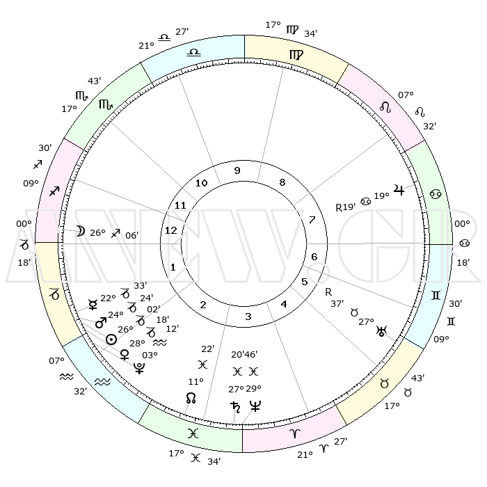 | | ΘΕΣΕΙΣ ΠΛΑΝΗΤΩΝ ΑΣΤΡΟΛΟΓΙΚΟΥ ΧΑΡΤΗ ΤΗΣ ΣΤΙΓΜΗΣ ΑΥΤΗΣ | | | | Πλανήτης | Ζώδιο | Μοίρες | Δεκαήμ. | Σε οίκο | Απόκλιση | | Ακμές των οίκων | | Ηλιος | Αιγόκερως | 25°53' | Τρίτο | 3 | 20 S 58 | | 1ος | 16°29' | Σκορπιός | | Σελήνη | Τοξότης | 24°21' | Τρίτο | 2 | 28 S 16 | | 2ος | 16°06' | Τοξότης | | Ερμής | Αιγόκερως | 22°18' | Τρίτο | 3 | 23 S 24 | | 3ος | 19°46' | Αιγόκερως | | Αφροδίτη | Αιγόκερως | 28°07' | Τρίτο | 3 | 21 S 31 | | 4ος | 25°09' | Υδροχόος | | Αρης | Αιγόκερως | 24°17' | Τρίτο | 3 | 22 S 13 | | 5ος | 27°29' | Ιχθείς | | Δίας | Καρκίνος | 19°20'R | Δεύτερο | 8 | 22 N 19 | | 6ος | 24°20' | Κριός | | Κρόνος | Ιχθείς | 27°20' | Τρίτο | 4 | 03 S 06 | | 7ος | 16°29' | Ταύρος | | Ουρανός | Ταύρος | 27°37'R | Τρίτο | 7 | 19 N 26 | | 8ος | 16°06' | Δίδυμοι | | Ποσειδώνας | Ιχθείς | 29°45' | Τρίτο | 5 | 01 S 19 | | 9ος | 19°47' | Καρκίνος | | Πλούτωνας | Υδροχόος | 03°11' | Πρώτο | 3 | 23 S 07 | | 10ος | 25°09' | Λέων | | Β. Δεσμός | Ιχθείς | 11°22' | Δεύτερο | 4 | 07 S 18 | | 11ος | 27°29' | Παρθένος | | Ωροσκόπος | Σκορπιός | 16°29' | Δεύτερο | | | 12ος | 24°20' | Ζυγός | | Μεσουράνημα | Λέων | 25°09' | Τρίτο | | | |