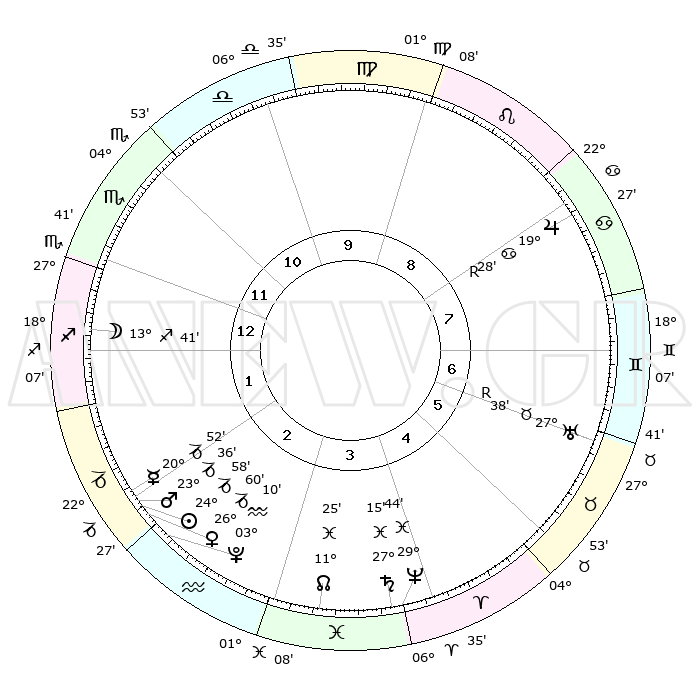 | | ΘΕΣΕΙΣ ΠΛΑΝΗΤΩΝ ΑΣΤΡΟΛΟΓΙΚΟΥ ΧΑΡΤΗ ΤΗΣ ΣΤΙΓΜΗΣ ΑΥΤΗΣ | | | | Πλανήτης | Ζώδιο | Μοίρες | Δεκαήμ. | Σε οίκο | Απόκλιση | | Ακμές των οίκων | | Ηλιος | Αιγόκερως | 24°54' | Τρίτο | 2 | 21 S 09 | | 1ος | 26°47' | Σκορπιός | | Σελήνη | Τοξότης | 12°49' | Δεύτερο | 1 | 27 S 24 | | 2ος | 27°29' | Τοξότης | | Ερμής | Αιγόκερως | 20°45' | Τρίτο | 2 | 23 S 36 | | 3ος | 02°40' | Υδροχόος | | Αφροδίτη | Αιγόκερως | 26°54' | Τρίτο | 2 | 21 S 44 | | 4ος | 08°37' | Ιχθείς | | Αρης | Αιγόκερως | 23°32' | Τρίτο | 2 | 22 S 20 | | 5ος | 10°01' | Κριός | | Δίας | Καρκίνος | 19°28'R | Δεύτερο | 8 | 22 N 17 | | 6ος | 05°31' | Ταύρος | | Κρόνος | Ιχθείς | 27°15' | Τρίτο | 4 | 03 S 08 | | 7ος | 26°46' | Ταύρος | | Ουρανός | Ταύρος | 27°38'R | Τρίτο | 7 | 19 N 26 | | 8ος | 27°29' | Δίδυμοι | | Ποσειδώνας | Ιχθείς | 29°44' | Τρίτο | 4 | 01 S 19 | | 9ος | 02°40' | Λέων | | Πλούτωνας | Υδροχόος | 03°10' | Πρώτο | 3 | 23 S 08 | | 10ος | 08°37' | Παρθένος | | Β. Δεσμός | Ιχθείς | 11°26' | Δεύτερο | 4 | 07 S 17 | | 11ος | 10°01' | Ζυγός | | Ωροσκόπος | Σκορπιός | 26°47' | Τρίτο | | | 12ος | 05°31' | Σκορπιός | | Μεσουράνημα | Παρθένος | 08°37' | Πρώτο | | | |