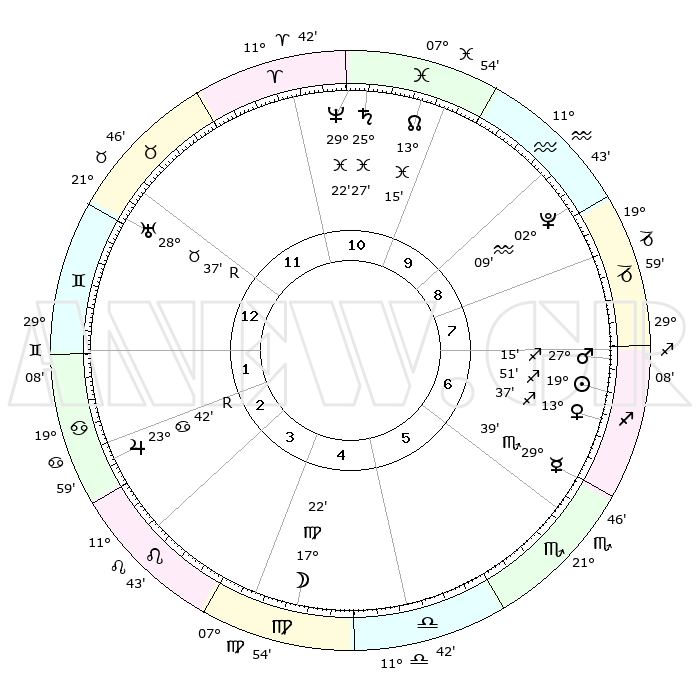 | | ΘΕΣΕΙΣ ΠΛΑΝΗΤΩΝ ΑΣΤΡΟΛΟΓΙΚΟΥ ΧΑΡΤΗ ΤΗΣ ΣΤΙΓΜΗΣ ΑΥΤΗΣ | | | | Πλανήτης | Ζώδιο | Μοίρες | Δεκαήμ. | Σε οίκο | Απόκλιση | | Ακμές των οίκων | | Ηλιος | Τοξότης | 18°53' | Δεύτερο | 6 | 22 S 58 | | 1ος | 11°11' | Καρκίνος | | Σελήνη | Παρθένος | 05°06' | Πρώτο | 3 | 10 N 18 | | 2ος | 01°36' | Λέων | | Ερμής | Σκορπιός | 28°30' | Τρίτο | 5 | 17 S 49 | | 3ος | 24°21' | Λέων | | Αφροδίτη | Τοξότης | 12°24' | Δεύτερο | 6 | 21 S 57 | | 4ος | 22°31' | Παρθένος | | Αρης | Τοξότης | 26°32' | Τρίτο | 6 | 24 S 08 | | 5ος | 27°54' | Ζυγός | | Δίας | Καρκίνος | 23°47'R | Τρίτο | 1 | 21 N 31 | | 6ος | 06°41' | Τοξότης | | Κρόνος | Ιχθείς | 25°25' | Τρίτο | 10 | 03 S 58 | | 7ος | 11°11' | Αιγόκερως | | Ουρανός | Ταύρος | 28°39'R | Τρίτο | 11 | 19 N 39 | | 8ος | 01°36' | Υδροχόος | | Ποσειδώνας | Ιχθείς | 29°22' | Τρίτο | 10 | 01 S 29 | | 9ος | 24°21' | Υδροχόος | | Πλούτωνας | Υδροχόος | 02°08' | Πρώτο | 8 | 23 S 21 | | 10ος | 22°31' | Ιχθείς | | Β. Δεσμός | Ιχθείς | 13°18' | Δεύτερο | 9 | 06 S 34 | | 11ος | 27°54' | Κριός | | Ωροσκόπος | Καρκίνος | 11°11' | Δεύτερο | | | 12ος | 06°41' | Δίδυμοι | | Μεσουράνημα | Ιχθείς | 22°31' | Τρίτο | | | |