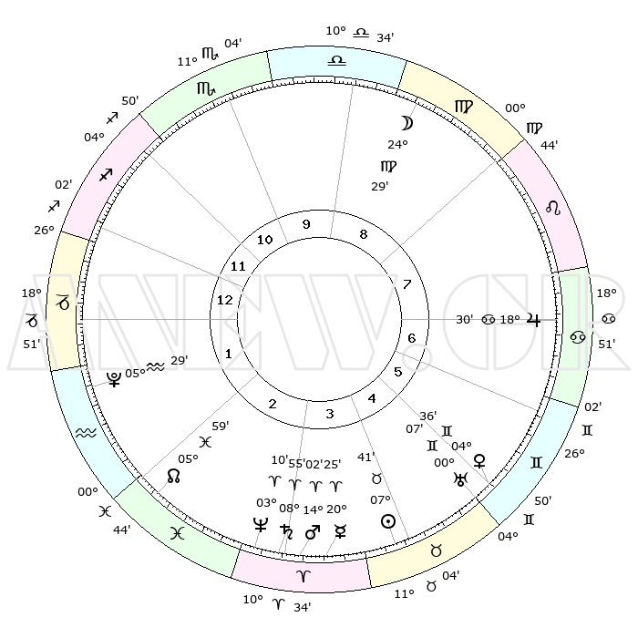 | | ΘΕΣΕΙΣ ΠΛΑΝΗΤΩΝ ΑΣΤΡΟΛΟΓΙΚΟΥ ΧΑΡΤΗ ΤΗΣ ΣΤΙΓΜΗΣ ΑΥΤΗΣ | | | | Πλανήτης | Ζώδιο | Μοίρες | Δεκαήμ. | Σε οίκο | Απόκλιση | | Ακμές των οίκων | | Ηλιος | Ταύρος | 07°37' | Πρώτο | 4 | 14 N 03 | | 1ος | 26°41' | Τοξότης | | Σελήνη | Παρθένος | 23°41' | Τρίτο | 9 | 01 N 11 | | 2ος | 02°60' | Υδροχόος | | Ερμής | Κριός | 20°18' | Τρίτο | 4 | 05 N 52 | | 3ος | 12°43' | Ιχθείς | | Αφροδίτη | Δίδυμοι | 04°31' | Πρώτο | 5 | 21 N 47 | | 4ος | 17°10' | Κριός | | Αρης | Κριός | 13°59' | Δεύτερο | 3 | 04 N 41 | | 5ος | 14°01' | Ταύρος | | Δίας | Καρκίνος | 18°30' | Δεύτερο | 7 | 22 N 32 | | 6ος | 06°03' | Δίδυμοι | | Κρόνος | Κριός | 08°54' | Πρώτο | 3 | 01 N 32 | | 7ος | 26°40' | Δίδυμοι | | Ουρανός | Δίδυμοι | 00°06' | Πρώτο | 5 | 20 N 00 | | 8ος | 02°60' | Λέων | | Ποσειδώνας | Κριός | 03°10' | Πρώτο | 3 | 00 N 03 | | 9ος | 12°43' | Παρθένος | | Πλούτωνας | Υδροχόος | 05°29' | Πρώτο | 2 | 22 S 48 | | 10ος | 17°10' | Ζυγός | | Β. Δεσμός | Ιχθείς | 05°59' | Πρώτο | 2 | 09 S 19 | | 11ος | 14°01' | Σκορπιός | | Ωροσκόπος | Τοξότης | 26°41' | Τρίτο | | | 12ος | 06°03' | Τοξότης | | Μεσουράνημα | Ζυγός | 17°10' | Δεύτερο | | | |