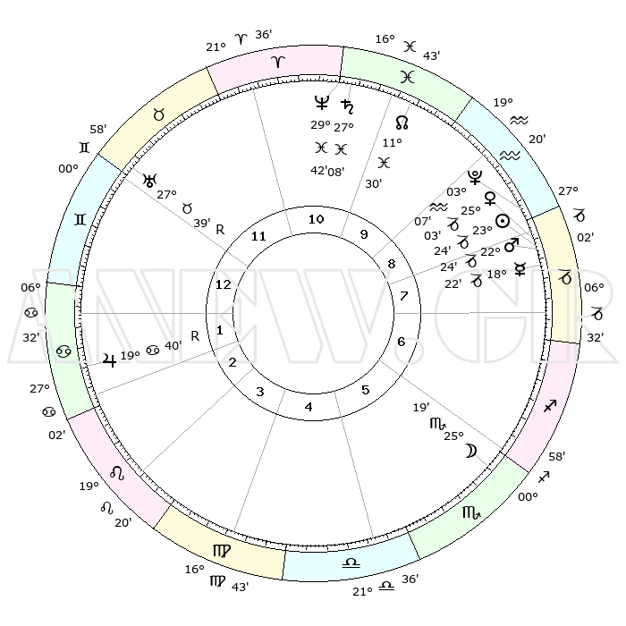 | | ΘΕΣΕΙΣ ΠΛΑΝΗΤΩΝ ΑΣΤΡΟΛΟΓΙΚΟΥ ΧΑΡΤΗ ΤΗΣ ΣΤΙΓΜΗΣ ΑΥΤΗΣ | | | | Πλανήτης | Ζώδιο | Μοίρες | Δεκαήμ. | Σε οίκο | Απόκλιση | | Ακμές των οίκων | | Ηλιος | Αιγόκερως | 23°18' | Τρίτο | 9 | 21 S 25 | | 1ος | 01°46' | Δίδυμοι | | Σελήνη | Σκορπιός | 24°10' | Τρίτο | 6 | 23 S 35 | | 2ος | 26°14' | Δίδυμοι | | Ερμής | Αιγόκερως | 18°12' | Δεύτερο | 9 | 23 S 52 | | 3ος | 17°35' | Καρκίνος | | Αφροδίτη | Αιγόκερως | 24°56' | Τρίτο | 9 | 22 S 03 | | 4ος | 10°29' | Λέων | | Αρης | Αιγόκερως | 22°19' | Τρίτο | 9 | 22 S 32 | | 5ος | 09°15' | Παρθένος | | Δίας | Καρκίνος | 19°41'R | Δεύτερο | 3 | 22 N 15 | | 6ος | 17°58' | Ζυγός | | Κρόνος | Ιχθείς | 27°08' | Τρίτο | 11 | 03 S 11 | | 7ος | 01°46' | Τοξότης | | Ουρανός | Ταύρος | 27°39'R | Τρίτο | 12 | 19 N 27 | | 8ος | 26°14' | Τοξότης | | Ποσειδώνας | Ιχθείς | 29°42' | Τρίτο | 11 | 01 S 20 | | 9ος | 17°35' | Αιγόκερως | | Πλούτωνας | Υδροχόος | 03°07' | Πρώτο | 9 | 23 S 08 | | 10ος | 10°29' | Υδροχόος | | Β. Δεσμός | Ιχθείς | 11°30' | Δεύτερο | 11 | 07 S 15 | | 11ος | 09°15' | Ιχθείς | | Ωροσκόπος | Δίδυμοι | 01°46' | Πρώτο | | | 12ος | 17°58' | Κριός | | Μεσουράνημα | Υδροχόος | 10°29' | Δεύτερο | | | |