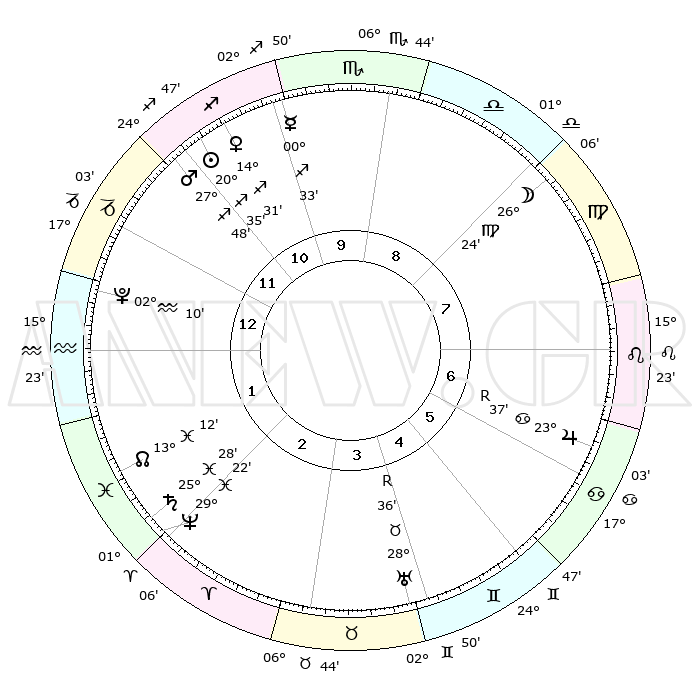 | | ΘΕΣΕΙΣ ΠΛΑΝΗΤΩΝ ΑΣΤΡΟΛΟΓΙΚΟΥ ΧΑΡΤΗ ΤΗΣ ΣΤΙΓΜΗΣ ΑΥΤΗΣ | | | | Πλανήτης | Ζώδιο | Μοίρες | Δεκαήμ. | Σε οίκο | Απόκλιση | | Ακμές των οίκων | | Ηλιος | Τοξότης | 20°30' | Τρίτο | 12 | 23 S 06 | | 1ος | 09°42' | Αιγόκερως | | Σελήνη | Παρθένος | 25°20' | Τρίτο | 8 | 00 N 52 | | 2ος | 19°20' | Υδροχόος | | Ερμής | Τοξότης | 00°26' | Πρώτο | 11 | 18 S 25 | | 3ος | 29°38' | Ιχθείς | | Αφροδίτη | Τοξότης | 14°25' | Δεύτερο | 11 | 22 S 15 | | 4ος | 01°52' | Ταύρος | | Αρης | Τοξότης | 27°44' | Τρίτο | 12 | 24 S 10 | | 5ος | 26°45' | Ταύρος | | Δίας | Καρκίνος | 23°38'R | Τρίτο | 7 | 21 N 33 | | 6ος | 18°05' | Δίδυμοι | | Κρόνος | Ιχθείς | 25°27' | Τρίτο | 2 | 03 S 57 | | 7ος | 09°42' | Καρκίνος | | Ουρανός | Ταύρος | 28°36'R | Τρίτο | 5 | 19 N 39 | | 8ος | 19°20' | Λέων | | Ποσειδώνας | Ιχθείς | 29°22' | Τρίτο | 2 | 01 S 29 | | 9ος | 29°38' | Παρθένος | | Πλούτωνας | Υδροχόος | 02°10' | Πρώτο | 1 | 23 S 20 | | 10ος | 01°52' | Σκορπιός | | Β. Δεσμός | Ιχθείς | 13°13' | Δεύτερο | 2 | 06 S 36 | | 11ος | 26°45' | Σκορπιός | | Ωροσκόπος | Αιγόκερως | 09°42' | Πρώτο | | | 12ος | 18°05' | Τοξότης | | Μεσουράνημα | Σκορπιός | 01°52' | Πρώτο | | | |