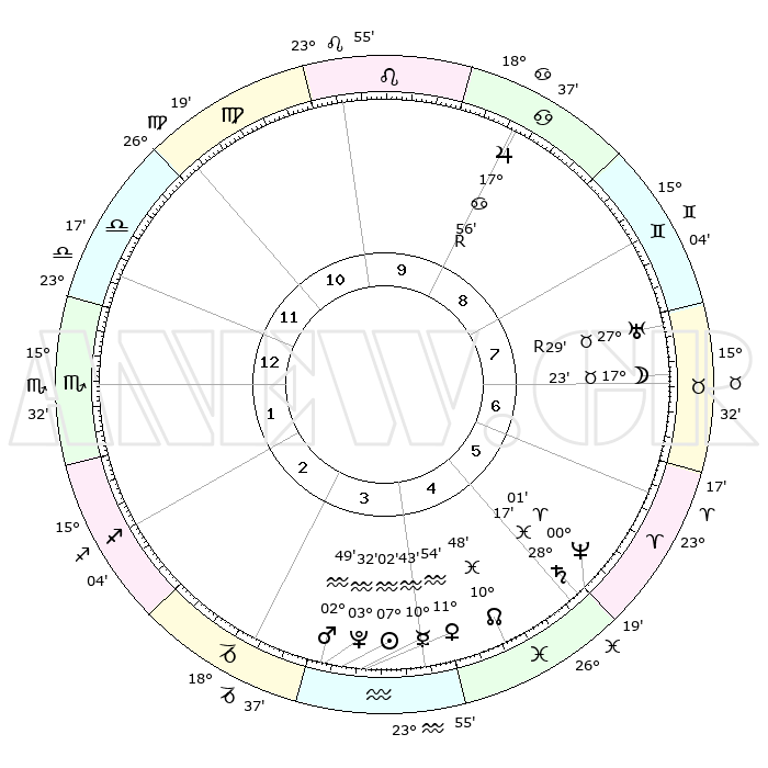 | | ΘΕΣΕΙΣ ΠΛΑΝΗΤΩΝ ΑΣΤΡΟΛΟΓΙΚΟΥ ΧΑΡΤΗ ΤΗΣ ΣΤΙΓΜΗΣ ΑΥΤΗΣ | | | | Πλανήτης | Ζώδιο | Μοίρες | Δεκαήμ. | Σε οίκο | Απόκλιση | | Ακμές των οίκων | | Ηλιος | Υδροχόος | 06°58' | Πρώτο | 4 | 18 S 32 | | 1ος | 23°57' | Ζυγός | | Σελήνη | Ταύρος | 16°20' | Δεύτερο | 7 | 21 N 18 | | 2ος | 22°01' | Σκορπιός | | Ερμής | Υδροχόος | 10°35' | Δεύτερο | 4 | 19 S 34 | | 3ος | 23°33' | Τοξότης | | Αφροδίτη | Υδροχόος | 11°48' | Δεύτερο | 4 | 18 S 28 | | 4ος | 27°21' | Αιγόκερως | | Αρης | Υδροχόος | 02°46' | Πρώτο | 4 | 20 S 32 | | 5ος | 00°18' | Ιχθείς | | Δίας | Καρκίνος | 17°57'R | Δεύτερο | 9 | 22 N 31 | | 6ος | 29°29' | Ιχθείς | | Κρόνος | Ιχθείς | 28°16' | Τρίτο | 5 | 02 S 42 | | 7ος | 23°57' | Κριός | | Ουρανός | Ταύρος | 27°29'R | Τρίτο | 8 | 19 N 24 | | 8ος | 22°01' | Ταύρος | | Ποσειδώνας | Κριός | 00°00' | Πρώτο | 6 | 01 S 12 | | 9ος | 23°33' | Δίδυμοι | | Πλούτωνας | Υδροχόος | 03°32' | Πρώτο | 4 | 23 S 03 | | 10ος | 27°21' | Καρκίνος | | Β. Δεσμός | Ιχθείς | 10°48' | Δεύτερο | 5 | 07 S 31 | | 11ος | 00°18' | Παρθένος | | Ωροσκόπος | Ζυγός | 23°57' | Τρίτο | | | 12ος | 29°29' | Παρθένος | | Μεσουράνημα | Καρκίνος | 27°21' | Τρίτο | | | |
