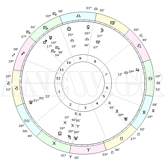 | ΘΕΣΕΙΣ ΠΛΑΝΗΤΩΝ ΑΣΤΡΟΛΟΓΙΚΟΥ ΧΑΡΤΗ ΤΗΣ ΣΤΙΓΜΗΣ ΑΥΤΗΣ | | Πλανήτης | Ζώδιο | Μοίρες | Δεκαήμ. | Σε οίκο | Απόκλιση | | Ακμές των οίκων | Ηλιος | Ζυγός | 24°57' | Τρίτο | 2 | 09 S 40 | | 1ος | 23°30' | Παρθένος | Σελήνη | Παρθένος | 16°43' | Δεύτερο | 12 | 05 N 21 | | 2ος | 19°35' | Ζυγός | Ερμής | Σκορπιός | 16°17' | Δεύτερο | 2 | 18 S 40 | | 3ος | 19°45' | Σκορπιός | Αφροδίτη | Ζυγός | 05°14' | Πρώτο | 1 | 00 S 40 | | 4ος | 22°41' | Τοξότης | Αρης | Σκορπιός | 17°39' | Δεύτερο | 2 | 17 S 20 | | 5ος | 25°46' | Αιγόκερως | Δίας | Καρκίνος | 24°11' | Τρίτο | 10 | 21 N 20 | | 6ος | 26°27' | Υδροχόος | Κρόνος | Ιχθείς | 26°41'R | Τρίτο | 7 | 03 S 36 | | 7ος | 23°30' | Ιχθείς | Ουρανός | Δίδυμοι | 00°46'R | Πρώτο | 9 | 20 N 06 | | 8ος | 19°35' | Κριός | Ποσειδώνας | Κριός | 00°06'R | Πρώτο | 7 | 01 S 13 | | 9ος | 19°45' | Ταύρος | Πλούτωνας | Υδροχόος | 01°22' | Πρώτο | 5 | 23 S 32 | | 10ος | 22°41' | Δίδυμοι | Β. Δεσμός | Ιχθείς | 16°08' | Δεύτερο | 6 | 05 S 28 | | 11ος | 25°47' | Καρκίνος | Ωροσκόπος | Παρθένος | 23°30' | Τρίτο | | | 12ος | 26°27' | Λέων | Μεσουράνημα | Δίδυμοι | 22°41' | Τρίτο | | | |