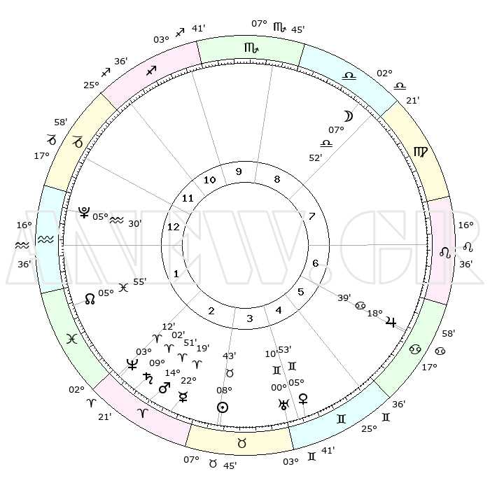 | | ΘΕΣΕΙΣ ΠΛΑΝΗΤΩΝ ΑΣΤΡΟΛΟΓΙΚΟΥ ΧΑΡΤΗ ΤΗΣ ΣΤΙΓΜΗΣ ΑΥΤΗΣ | | | | Πλανήτης | Ζώδιο | Μοίρες | Δεκαήμ. | Σε οίκο | Απόκλιση | | Ακμές των οίκων | | Ηλιος | Ταύρος | 08°40' | Πρώτο | 3 | 14 N 23 | | 1ος | 28°36' | Αιγόκερως | | Σελήνη | Ζυγός | 07°22' | Πρώτο | 8 | 05 S 16 | | 2ος | 12°28' | Ιχθείς | | Ερμής | Κριός | 22°15' | Τρίτο | 3 | 06 N 41 | | 3ος | 21°08' | Κριός | | Αφροδίτη | Δίδυμοι | 05°50' | Πρώτο | 4 | 22 N 04 | | 4ος | 19°50' | Ταύρος | | Αρης | Κριός | 14°49' | Δεύτερο | 2 | 05 N 00 | | 5ος | 12°42' | Δίδυμοι | | Δίας | Καρκίνος | 18°38' | Δεύτερο | 6 | 22 N 31 | | 6ος | 04°05' | Καρκίνος | | Κρόνος | Κριός | 09°02' | Πρώτο | 2 | 01 N 35 | | 7ος | 28°36' | Καρκίνος | | Ουρανός | Δίδυμοι | 00°10' | Πρώτο | 4 | 20 N 01 | | 8ος | 12°28' | Παρθένος | | Ποσειδώνας | Κριός | 03°12' | Πρώτο | 2 | 00 N 04 | | 9ος | 21°08' | Ζυγός | | Πλούτωνας | Υδροχόος | 05°30' | Πρώτο | 1 | 22 S 49 | | 10ος | 19°50' | Σκορπιός | | Β. Δεσμός | Ιχθείς | 05°55' | Πρώτο | 1 | 09 S 20 | | 11ος | 12°42' | Τοξότης | | Ωροσκόπος | Αιγόκερως | 28°36' | Τρίτο | | | 12ος | 04°05' | Αιγόκερως | | Μεσουράνημα | Σκορπιός | 19°50' | Δεύτερο | | | |