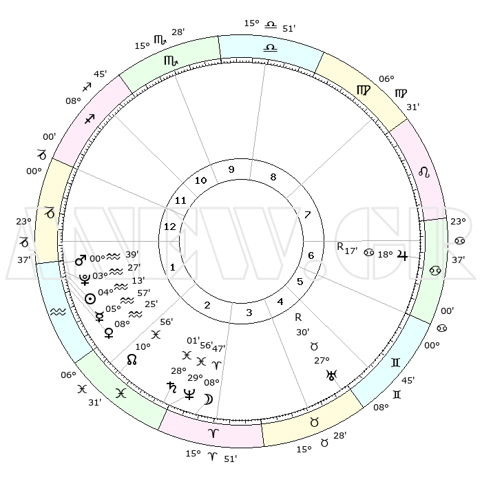 | | ΘΕΣΕΙΣ ΠΛΑΝΗΤΩΝ ΑΣΤΡΟΛΟΓΙΚΟΥ ΧΑΡΤΗ ΤΗΣ ΣΤΙΓΜΗΣ ΑΥΤΗΣ | | | | Πλανήτης | Ζώδιο | Μοίρες | Δεκαήμ. | Σε οίκο | Απόκλιση | | Ακμές των οίκων | | Ηλιος | Υδροχόος | 04°08' | Πρώτο | 2 | 19 S 13 | | 1ος | 27°27' | Τοξότης | | Σελήνη | Κριός | 07°48' | Πρώτο | 3 | 05 N 22 | | 2ος | 03°57' | Υδροχόος | | Ερμής | Υδροχόος | 05°49' | Πρώτο | 2 | 20 S 50 | | 3ος | 13°45' | Ιχθείς | | Αφροδίτη | Υδροχόος | 08°19' | Πρώτο | 2 | 19 S 21 | | 4ος | 18°05' | Κριός | | Αρης | Υδροχόος | 00°36' | Πρώτο | 1 | 21 S 00 | | 5ος | 14°49' | Ταύρος | | Δίας | Καρκίνος | 18°17'R | Δεύτερο | 7 | 22 N 28 | | 6ος | 06°47' | Δίδυμοι | | Κρόνος | Ιχθείς | 28°01' | Τρίτο | 3 | 02 S 48 | | 7ος | 27°27' | Δίδυμοι | | Ουρανός | Ταύρος | 27°30'R | Τρίτο | 5 | 19 N 25 | | 8ος | 03°57' | Λέων | | Ποσειδώνας | Ιχθείς | 29°56' | Τρίτο | 3 | 01 S 14 | | 9ος | 13°45' | Παρθένος | | Πλούτωνας | Υδροχόος | 03°27' | Πρώτο | 1 | 23 S 04 | | 10ος | 18°05' | Ζυγός | | Β. Δεσμός | Ιχθείς | 10°57' | Δεύτερο | 2 | 07 S 28 | | 11ος | 14°49' | Σκορπιός | | Ωροσκόπος | Τοξότης | 27°27' | Τρίτο | | | 12ος | 06°47' | Τοξότης | | Μεσουράνημα | Ζυγός | 18°05' | Δεύτερο | | | |