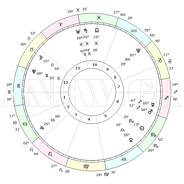 | | ΘΕΣΕΙΣ ΠΛΑΝΗΤΩΝ ΑΣΤΡΟΛΟΓΙΚΟΥ ΧΑΡΤΗ ΤΗΣ ΣΤΙΓΜΗΣ ΑΥΤΗΣ | | | | Πλανήτης | Ζώδιο | Μοίρες | Δεκαήμ. | Σε οίκο | Απόκλιση | | Ακμές των οίκων | | Ηλιος | Σκορπιός | 13°27' | Δεύτερο | 7 | 15 S 52 | | 1ος | 05°19' | Ταύρος | | Σελήνη | Ταύρος | 14°22' | Δεύτερο | 1 | 20 N 14 | | 2ος | 06°05' | Δίδυμοι | | Ερμής | Τοξότης | 05°43' | Πρώτο | 7 | 24 S 00 | | 3ος | 29°08' | Δίδυμοι | | Αφροδίτη | Ζυγός | 28°21' | Τρίτο | 6 | 09 S 34 | | 4ος | 20°51' | Καρκίνος | | Αρης | Τοξότης | 00°47' | Πρώτο | 7 | 20 S 44 | | 5ος | 15°49' | Λέων | | Δίας | Καρκίνος | 25°05' | Τρίτο | 4 | 21 N 12 | | 6ος | 19°36' | Παρθένος | | Κρόνος | Ιχθείς | 25°44'R | Τρίτο | 12 | 03 S 57 | | 7ος | 05°19' | Σκορπιός | | Ουρανός | Δίδυμοι | 00°06'R | Πρώτο | 1 | 19 N 58 | | 8ος | 06°05' | Τοξότης | | Ποσειδώνας | Ιχθείς | 29°42'R | Τρίτο | 12 | 01 S 22 | | 9ος | 29°08' | Τοξότης | | Πλούτωνας | Υδροχόος | 01°29' | Πρώτο | 10 | 23 S 30 | | 10ος | 20°51' | Αιγόκερως | | Β. Δεσμός | Ιχθείς | 15°09' | Δεύτερο | 11 | 05 S 51 | | 11ος | 15°49' | Υδροχόος | | Ωροσκόπος | Ταύρος | 05°19' | Πρώτο | | | 12ος | 19°36' | Ιχθείς | | Μεσουράνημα | Αιγόκερως | 20°51' | Τρίτο | | | |