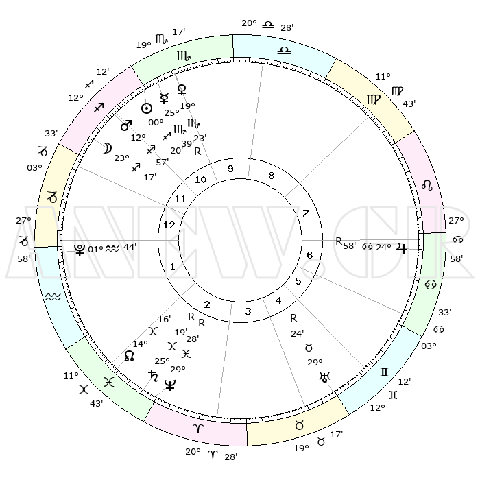 | | ΘΕΣΕΙΣ ΠΛΑΝΗΤΩΝ ΑΣΤΡΟΛΟΓΙΚΟΥ ΧΑΡΤΗ ΤΗΣ ΣΤΙΓΜΗΣ ΑΥΤΗΣ | | | | Πλανήτης | Ζώδιο | Μοίρες | Δεκαήμ. | Σε οίκο | Απόκλιση | | Ακμές των οίκων | | Ηλιος | Τοξότης | 00°17' | Πρώτο | 11 | 20 S 12 | | 1ος | 07°35' | Αιγόκερως | | Σελήνη | Τοξότης | 22°39' | Τρίτο | 12 | 28 S 11 | | 2ος | 16°40' | Υδροχόος | | Ερμής | Σκορπιός | 25°43'R | Τρίτο | 11 | 18 S 03 | | 3ος | 26°58' | Ιχθείς | | Αφροδίτη | Σκορπιός | 19°19' | Δεύτερο | 10 | 16 S 36 | | 4ος | 29°36' | Κριός | | Αρης | Τοξότης | 12°55' | Δεύτερο | 11 | 22 S 56 | | 5ος | 24°47' | Ταύρος | | Δίας | Καρκίνος | 24°58'R | Τρίτο | 7 | 21 N 16 | | 6ος | 16°11' | Δίδυμοι | | Κρόνος | Ιχθείς | 25°19'R | Τρίτο | 2 | 04 S 04 | | 7ος | 07°35' | Καρκίνος | | Ουρανός | Ταύρος | 29°24'R | Τρίτο | 5 | 19 N 49 | | 8ος | 16°40' | Λέων | | Ποσειδώνας | Ιχθείς | 29°28'R | Τρίτο | 3 | 01 S 28 | | 9ος | 26°58' | Παρθένος | | Πλούτωνας | Υδροχόος | 01°44' | Πρώτο | 1 | 23 S 26 | | 10ος | 29°36' | Ζυγός | | Β. Δεσμός | Ιχθείς | 14°16' | Δεύτερο | 2 | 06 S 11 | | 11ος | 24°47' | Σκορπιός | | Ωροσκόπος | Αιγόκερως | 07°35' | Πρώτο | | | 12ος | 16°11' | Τοξότης | | Μεσουράνημα | Ζυγός | 29°36' | Τρίτο | | | |