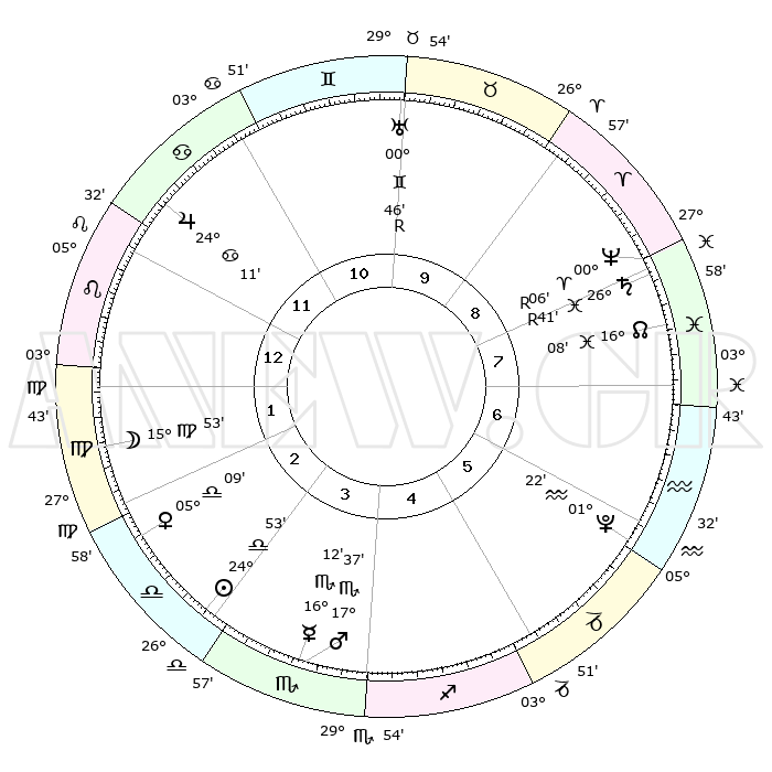 | ΘΕΣΕΙΣ ΠΛΑΝΗΤΩΝ ΑΣΤΡΟΛΟΓΙΚΟΥ ΧΑΡΤΗ ΤΗΣ ΣΤΙΓΜΗΣ ΑΥΤΗΣ | | Πλανήτης | Ζώδιο | Μοίρες | Δεκαήμ. | Σε οίκο | Απόκλιση | | Ακμές των οίκων | Ηλιος | Ζυγός | 24°38' | Τρίτο | 5 | 09 S 32 | | 1ος | 12°02' | Δίδυμοι | Σελήνη | Παρθένος | 12°35' | Δεύτερο | 4 | 07 N 17 | | 2ος | 04°43' | Καρκίνος | Ερμής | Σκορπιός | 15°51' | Δεύτερο | 6 | 18 S 30 | | 3ος | 25°56' | Καρκίνος | Αφροδίτη | Ζυγός | 04°49' | Πρώτο | 5 | 00 S 31 | | 4ος | 19°48' | Λέων | Αρης | Σκορπιός | 17°26' | Δεύτερο | 6 | 17 S 16 | | 5ος | 20°28' | Παρθένος | Δίας | Καρκίνος | 24°09' | Τρίτο | 2 | 21 N 20 | | 6ος | 00°22' | Σκορπιός | Κρόνος | Ιχθείς | 26°42'R | Τρίτο | 11 | 03 S 36 | | 7ος | 12°02' | Τοξότης | Ουρανός | Δίδυμοι | 00°46'R | Πρώτο | 12 | 20 N 06 | | 8ος | 04°43' | Αιγόκερως | Ποσειδώνας | Κριός | 00°06'R | Πρώτο | 11 | 01 S 13 | | 9ος | 25°56' | Αιγόκερως | Πλούτωνας | Υδροχόος | 01°22' | Πρώτο | 9 | 23 S 32 | | 10ος | 19°48' | Υδροχόος | Β. Δεσμός | Ιχθείς | 16°09' | Δεύτερο | 10 | 05 S 28 | | 11ος | 20°28' | Ιχθείς | Ωροσκόπος | Δίδυμοι | 12°02' | Δεύτερο | | | 12ος | 00°22' | Ταύρος | Μεσουράνημα | Υδροχόος | 19°48' | Δεύτερο | | | |