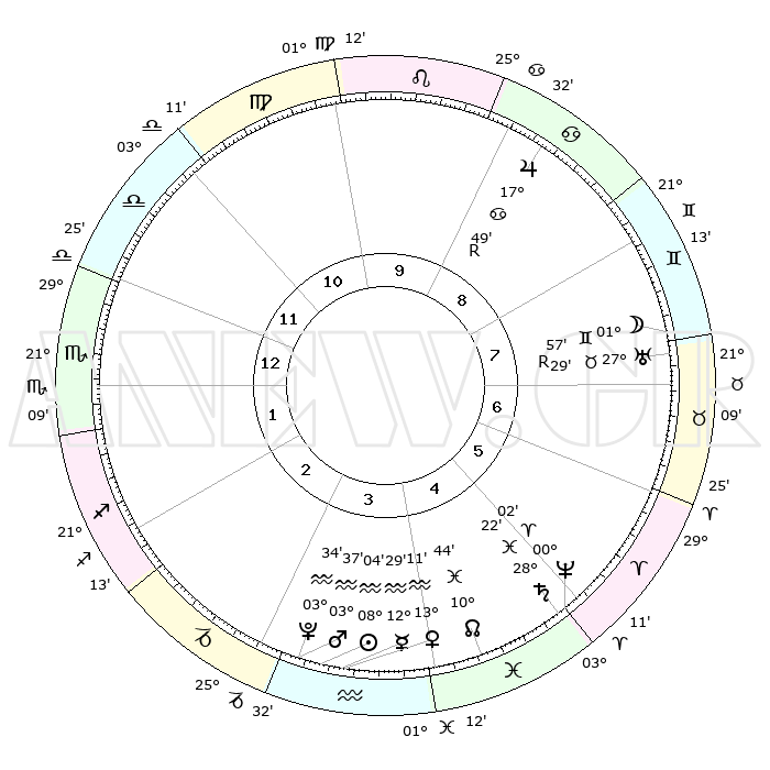 | | ΘΕΣΕΙΣ ΠΛΑΝΗΤΩΝ ΑΣΤΡΟΛΟΓΙΚΟΥ ΧΑΡΤΗ ΤΗΣ ΣΤΙΓΜΗΣ ΑΥΤΗΣ | | | | Πλανήτης | Ζώδιο | Μοίρες | Δεκαήμ. | Σε οίκο | Απόκλιση | | Ακμές των οίκων | | Ηλιος | Υδροχόος | 07°60' | Πρώτο | 4 | 18 S 16 | | 1ος | 29°37' | Ζυγός | | Σελήνη | Δίδυμοι | 00°52' | Πρώτο | 8 | 25 N 22 | | 2ος | 28°00' | Σκορπιός | | Ερμής | Υδροχόος | 12°21' | Δεύτερο | 4 | 19 S 04 | | 3ος | 29°56' | Τοξότης | | Αφροδίτη | Υδροχόος | 13°05' | Δεύτερο | 4 | 18 S 08 | | 4ος | 04°06' | Υδροχόος | | Αρης | Υδροχόος | 03°33' | Πρώτο | 3 | 20 S 21 | | 5ος | 07°01' | Ιχθείς | | Δίας | Καρκίνος | 17°50'R | Δεύτερο | 9 | 22 N 32 | | 6ος | 05°43' | Κριός | | Κρόνος | Ιχθείς | 28°22' | Τρίτο | 5 | 02 S 39 | | 7ος | 29°37' | Κριός | | Ουρανός | Ταύρος | 27°29'R | Τρίτο | 7 | 19 N 24 | | 8ος | 28°00' | Ταύρος | | Ποσειδώνας | Κριός | 00°02' | Πρώτο | 5 | 01 S 12 | | 9ος | 29°56' | Δίδυμοι | | Πλούτωνας | Υδροχόος | 03°34' | Πρώτο | 3 | 23 S 03 | | 10ος | 04°06' | Λέων | | Β. Δεσμός | Ιχθείς | 10°45' | Δεύτερο | 5 | 07 S 32 | | 11ος | 07°01' | Παρθένος | | Ωροσκόπος | Ζυγός | 29°37' | Τρίτο | | | 12ος | 05°43' | Ζυγός | | Μεσουράνημα | Λέων | 04°06' | Πρώτο | | | |