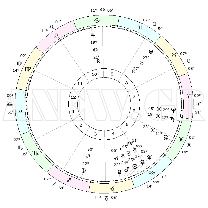 | | ΘΕΣΕΙΣ ΠΛΑΝΗΤΩΝ ΑΣΤΡΟΛΟΓΙΚΟΥ ΧΑΡΤΗ ΤΗΣ ΣΤΙΓΜΗΣ ΑΥΤΗΣ | | | | Πλανήτης | Ζώδιο | Μοίρες | Δεκαήμ. | Σε οίκο | Απόκλιση | | Ακμές των οίκων | | Ηλιος | Αιγόκερως | 25°40' | Τρίτο | 5 | 21 S 00 | | 1ος | 17°20' | Παρθένος | | Σελήνη | Τοξότης | 21°55' | Τρίτο | 4 | 28 S 12 | | 2ος | 12°53' | Ζυγός | | Ερμής | Αιγόκερως | 21°59' | Τρίτο | 5 | 23 S 27 | | 3ος | 12°46' | Σκορπιός | | Αφροδίτη | Αιγόκερως | 27°52' | Τρίτο | 5 | 21 S 34 | | 4ος | 15°42' | Τοξότης | | Αρης | Αιγόκερως | 24°08' | Τρίτο | 5 | 22 S 14 | | 5ος | 18°59' | Αιγόκερως | | Δίας | Καρκίνος | 19°22'R | Δεύτερο | 11 | 22 N 18 | | 6ος | 19°55' | Υδροχόος | | Κρόνος | Ιχθείς | 27°19' | Τρίτο | 7 | 03 S 06 | | 7ος | 17°20' | Ιχθείς | | Ουρανός | Ταύρος | 27°37'R | Τρίτο | 9 | 19 N 26 | | 8ος | 12°53' | Κριός | | Ποσειδώνας | Ιχθείς | 29°45' | Τρίτο | 7 | 01 S 19 | | 9ος | 12°46' | Ταύρος | | Πλούτωνας | Υδροχόος | 03°11' | Πρώτο | 5 | 23 S 07 | | 10ος | 15°42' | Δίδυμοι | | Β. Δεσμός | Ιχθείς | 11°23' | Δεύτερο | 6 | 07 S 18 | | 11ος | 18°59' | Καρκίνος | | Ωροσκόπος | Παρθένος | 17°20' | Δεύτερο | | | 12ος | 19°55' | Λέων | | Μεσουράνημα | Δίδυμοι | 15°42' | Δεύτερο | | | |