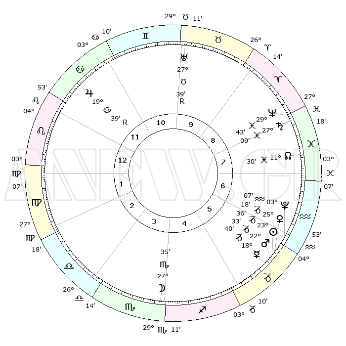 | | ΘΕΣΕΙΣ ΠΛΑΝΗΤΩΝ ΑΣΤΡΟΛΟΓΙΚΟΥ ΧΑΡΤΗ ΤΗΣ ΣΤΙΓΜΗΣ ΑΥΤΗΣ | | | | Πλανήτης | Ζώδιο | Μοίρες | Δεκαήμ. | Σε οίκο | Απόκλιση | | Ακμές των οίκων | | Ηλιος | Αιγόκερως | 23°31' | Τρίτο | 6 | 21 S 23 | | 1ος | 11°46' | Λέων | | Σελήνη | Σκορπιός | 26°42' | Τρίτο | 4 | 24 S 16 | | 2ος | 03°45' | Παρθένος | | Ερμής | Αιγόκερως | 18°33' | Δεύτερο | 6 | 23 S 50 | | 3ος | 00°23' | Ζυγός | | Αφροδίτη | Αιγόκερως | 25°12' | Τρίτο | 6 | 22 S 01 | | 4ος | 02°35' | Σκορπιός | | Αρης | Αιγόκερως | 22°29' | Τρίτο | 6 | 22 S 31 | | 5ος | 08°05' | Τοξότης | | Δίας | Καρκίνος | 19°39'R | Δεύτερο | 12 | 22 N 16 | | 6ος | 11°60' | Αιγόκερως | | Κρόνος | Ιχθείς | 27°09' | Τρίτο | 8 | 03 S 10 | | 7ος | 11°46' | Υδροχόος | | Ουρανός | Ταύρος | 27°39'R | Τρίτο | 10 | 19 N 27 | | 8ος | 03°45' | Ιχθείς | | Ποσειδώνας | Ιχθείς | 29°43' | Τρίτο | 8 | 01 S 20 | | 9ος | 00°23' | Κριός | | Πλούτωνας | Υδροχόος | 03°07' | Πρώτο | 6 | 23 S 08 | | 10ος | 02°35' | Ταύρος | | Β. Δεσμός | Ιχθείς | 11°30' | Δεύτερο | 8 | 07 S 15 | | 11ος | 08°05' | Δίδυμοι | | Ωροσκόπος | Λέων | 11°46' | Δεύτερο | | | 12ος | 11°60' | Καρκίνος | | Μεσουράνημα | Ταύρος | 02°35' | Πρώτο | | | |