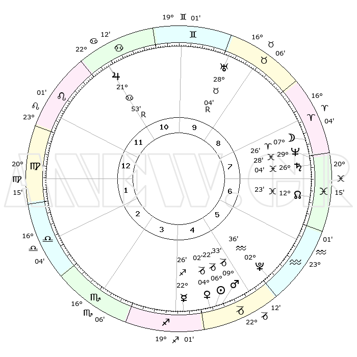 | | ΘΕΣΕΙΣ ΠΛΑΝΗΤΩΝ ΑΣΤΡΟΛΟΓΙΚΟΥ ΧΑΡΤΗ ΤΗΣ ΣΤΙΓΜΗΣ ΑΥΤΗΣ | | | | Πλανήτης | Ζώδιο | Μοίρες | Δεκαήμ. | Σε οίκο | Απόκλιση | | Ακμές των οίκων | | Ηλιος | Αιγόκερως | 06°18' | Πρώτο | 5 | 23 S 17 | | 1ος | 00°43' | Παρθένος | | Σελήνη | Κριός | 06°31' | Πρώτο | 8 | 04 N 35 | | 2ος | 24°39' | Παρθένος | | Ερμής | Τοξότης | 22°20' | Τρίτο | 4 | 23 S 18 | | 3ος | 23°23' | Ζυγός | | Αφροδίτη | Αιγόκερως | 03°57' | Πρώτο | 5 | 23 S 43 | | 4ος | 26°19' | Σκορπιός | | Αρης | Αιγόκερως | 09°30' | Πρώτο | 5 | 23 S 57 | | 5ος | 00°27' | Αιγόκερως | | Δίας | Καρκίνος | 21°53'R | Τρίτο | 11 | 21 N 53 | | 6ος | 02°21' | Υδροχόος | | Κρόνος | Ιχθείς | 26°03' | Τρίτο | 8 | 03 S 39 | | 7ος | 00°43' | Ιχθείς | | Ουρανός | Ταύρος | 28°04'R | Τρίτο | 10 | 19 N 32 | | 8ος | 24°39' | Ιχθείς | | Ποσειδώνας | Ιχθείς | 29°28' | Τρίτο | 8 | 01 S 26 | | 9ος | 23°23' | Κριός | | Πλούτωνας | Υδροχόος | 02°36' | Πρώτο | 6 | 23 S 15 | | 10ος | 26°19' | Ταύρος | | Β. Δεσμός | Ιχθείς | 12°23' | Δεύτερο | 7 | 06 S 55 | | 11ος | 00°27' | Καρκίνος | | Ωροσκόπος | Παρθένος | 00°43' | Πρώτο | | | 12ος | 02°21' | Λέων | | Μεσουράνημα | Ταύρος | 26°19' | Τρίτο | | | |