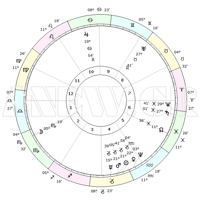 | | ΘΕΣΕΙΣ ΠΛΑΝΗΤΩΝ ΑΣΤΡΟΛΟΓΙΚΟΥ ΧΑΡΤΗ ΤΗΣ ΣΤΙΓΜΗΣ ΑΥΤΗΣ | | | | Πλανήτης | Ζώδιο | Μοίρες | Δεκαήμ. | Σε οίκο | Απόκλιση | | Ακμές των οίκων | | Ηλιος | Αιγόκερως | 21°29' | Τρίτο | 6 | 21 S 43 | | 1ος | 11°48' | Λέων | | Σελήνη | Σκορπιός | 03°03' | Πρώτο | 4 | 16 S 21 | | 2ος | 03°47' | Παρθένος | | Ερμής | Αιγόκερως | 15°21' | Δεύτερο | 6 | 24 S 06 | | 3ος | 00°25' | Ζυγός | | Αφροδίτη | Αιγόκερως | 22°41' | Τρίτο | 6 | 22 S 23 | | 4ος | 02°38' | Σκορπιός | | Αρης | Αιγόκερως | 20°57' | Τρίτο | 6 | 22 S 45 | | 5ος | 08°07' | Τοξότης | | Δίας | Καρκίνος | 19°55'R | Δεύτερο | 12 | 22 N 13 | | 6ος | 12°01' | Αιγόκερως | | Κρόνος | Ιχθείς | 26°60' | Τρίτο | 8 | 03 S 14 | | 7ος | 11°48' | Υδροχόος | | Ουρανός | Ταύρος | 27°41'R | Τρίτο | 10 | 19 N 27 | | 8ος | 03°47' | Ιχθείς | | Ποσειδώνας | Ιχθείς | 29°40' | Τρίτο | 8 | 01 S 21 | | 9ος | 00°25' | Κριός | | Πλούτωνας | Υδροχόος | 03°03' | Πρώτο | 6 | 23 S 09 | | 10ος | 02°38' | Ταύρος | | Β. Δεσμός | Ιχθείς | 11°36' | Δεύτερο | 8 | 07 S 13 | | 11ος | 08°07' | Δίδυμοι | | Ωροσκόπος | Λέων | 11°48' | Δεύτερο | | | 12ος | 12°01' | Καρκίνος | | Μεσουράνημα | Ταύρος | 02°38' | Πρώτο | | | |