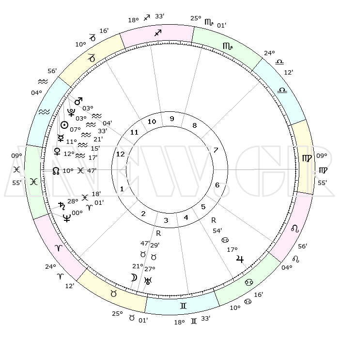 | | ΘΕΣΕΙΣ ΠΛΑΝΗΤΩΝ ΑΣΤΡΟΛΟΓΙΚΟΥ ΧΑΡΤΗ ΤΗΣ ΣΤΙΓΜΗΣ ΑΥΤΗΣ | | | | Πλανήτης | Ζώδιο | Μοίρες | Δεκαήμ. | Σε οίκο | Απόκλιση | | Ακμές των οίκων | | Ηλιος | Υδροχόος | 07°17' | Πρώτο | 1 | 18 S 27 | | 1ος | 02°33' | Υδροχόος | | Σελήνη | Ταύρος | 20°43' | Τρίτο | 3 | 22 N 41 | | 2ος | 17°03' | Ιχθείς | | Ερμής | Υδροχόος | 11°07' | Δεύτερο | 1 | 19 S 25 | | 3ος | 25°05' | Κριός | | Αφροδίτη | Υδροχόος | 12°12' | Δεύτερο | 1 | 18 S 22 | | 4ος | 23°07' | Ταύρος | | Αρης | Υδροχόος | 03°00' | Πρώτο | 1 | 20 S 29 | | 5ος | 15°42' | Δίδυμοι | | Δίας | Καρκίνος | 17°55'R | Δεύτερο | 6 | 22 N 32 | | 6ος | 07°13' | Καρκίνος | | Κρόνος | Ιχθείς | 28°18' | Τρίτο | 2 | 02 S 41 | | 7ος | 02°33' | Λέων | | Ουρανός | Ταύρος | 27°29'R | Τρίτο | 4 | 19 N 24 | | 8ος | 17°03' | Παρθένος | | Ποσειδώνας | Κριός | 00°01' | Πρώτο | 2 | 01 S 12 | | 9ος | 25°05' | Ζυγός | | Πλούτωνας | Υδροχόος | 03°33' | Πρώτο | 1 | 23 S 03 | | 10ος | 23°07' | Σκορπιός | | Β. Δεσμός | Ιχθείς | 10°47' | Δεύτερο | 1 | 07 S 31 | | 11ος | 15°42' | Τοξότης | | Ωροσκόπος | Υδροχόος | 02°33' | Πρώτο | | | 12ος | 07°13' | Αιγόκερως | | Μεσουράνημα | Σκορπιός | 23°07' | Τρίτο | | | |