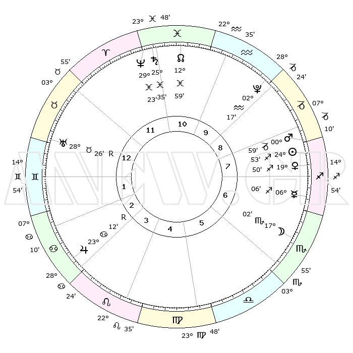 | | ΘΕΣΕΙΣ ΠΛΑΝΗΤΩΝ ΑΣΤΡΟΛΟΓΙΚΟΥ ΧΑΡΤΗ ΤΗΣ ΣΤΙΓΜΗΣ ΑΥΤΗΣ | | | | Πλανήτης | Ζώδιο | Μοίρες | Δεκαήμ. | Σε οίκο | Απόκλιση | | Ακμές των οίκων | | Ηλιος | Τοξότης | 24°35' | Τρίτο | 12 | 23 S 19 | | 1ος | 16°45' | Αιγόκερως | | Σελήνη | Σκορπιός | 13°29' | Δεύτερο | 10 | 20 S 03 | | 2ος | 28°08' | Υδροχόος | | Ερμής | Τοξότης | 05°41' | Πρώτο | 11 | 19 S 54 | | 3ος | 08°08' | Κριός | | Αφροδίτη | Τοξότης | 19°27' | Δεύτερο | 11 | 22 S 54 | | 4ος | 09°02' | Ταύρος | | Αρης | Αιγόκερως | 00°45' | Πρώτο | 12 | 24 S 13 | | 5ος | 03°02' | Δίδυμοι | | Δίας | Καρκίνος | 23°14'R | Τρίτο | 7 | 21 N 38 | | 6ος | 24°15' | Δίδυμοι | | Κρόνος | Ιχθείς | 25°34' | Τρίτο | 2 | 03 S 53 | | 7ος | 16°45' | Καρκίνος | | Ουρανός | Ταύρος | 28°27'R | Τρίτο | 4 | 19 N 37 | | 8ος | 28°08' | Λέων | | Ποσειδώνας | Ιχθείς | 29°23' | Τρίτο | 2 | 01 S 29 | | 9ος | 08°08' | Ζυγός | | Πλούτωνας | Υδροχόος | 02°16' | Πρώτο | 1 | 23 S 19 | | 10ος | 09°02' | Σκορπιός | | Β. Δεσμός | Ιχθείς | 13°00' | Δεύτερο | 2 | 06 S 41 | | 11ος | 03°02' | Τοξότης | | Ωροσκόπος | Αιγόκερως | 16°45' | Δεύτερο | | | 12ος | 24°15' | Τοξότης | | Μεσουράνημα | Σκορπιός | 09°02' | Πρώτο | | | |