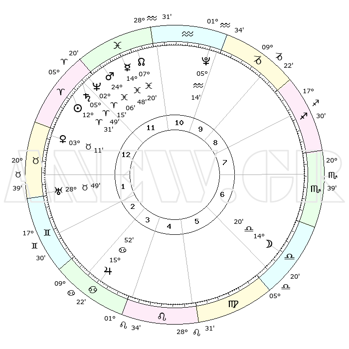 | | ΘΕΣΕΙΣ ΠΛΑΝΗΤΩΝ ΑΣΤΡΟΛΟΓΙΚΟΥ ΧΑΡΤΗ ΤΗΣ ΣΤΙΓΜΗΣ ΑΥΤΗΣ | | | | Πλανήτης | Ζώδιο | Μοίρες | Δεκαήμ. | Σε οίκο | Απόκλιση | | Ακμές των οίκων | | Ηλιος | Κριός | 12°27' | Δεύτερο | 12 | 04 N 55 | | 1ος | 20°33' | Κριός | | Σελήνη | Ζυγός | 13°36' | Δεύτερο | 6 | 08 S 06 | | 2ος | 25°24' | Ταύρος | | Ερμής | Ιχθείς | 14°45' | Δεύτερο | 12 | 07 S 23 | | 3ος | 20°00' | Δίδυμοι | | Αφροδίτη | Ταύρος | 03°07' | Πρώτο | 1 | 12 N 11 | | 4ος | 11°44' | Καρκίνος | | Αρης | Ιχθείς | 24°03' | Τρίτο | 12 | 03 S 19 | | 5ος | 05°17' | Λέων | | Δίας | Καρκίνος | 15°52' | Δεύτερο | 4 | 22 N 52 | | 6ος | 06°11' | Παρθένος | | Κρόνος | Κριός | 05°49' | Πρώτο | 12 | 00 N 21 | | 7ος | 20°33' | Ζυγός | | Ουρανός | Ταύρος | 28°49' | Τρίτο | 2 | 19 N 43 | | 8ος | 25°24' | Σκορπιός | | Ποσειδώνας | Κριός | 02°15' | Πρώτο | 12 | 00 S 18 | | 9ος | 20°00' | Τοξότης | | Πλούτωνας | Υδροχόος | 05°14' | Πρώτο | 10 | 22 S 47 | | 10ος | 11°44' | Αιγόκερως | | Β. Δεσμός | Ιχθείς | 07°20' | Πρώτο | 12 | 08 S 49 | | 11ος | 05°17' | Υδροχόος | | Ωροσκόπος | Κριός | 20°33' | Τρίτο | | | 12ος | 06°11' | Ιχθείς | | Μεσουράνημα | Αιγόκερως | 11°44' | Δεύτερο | | | |