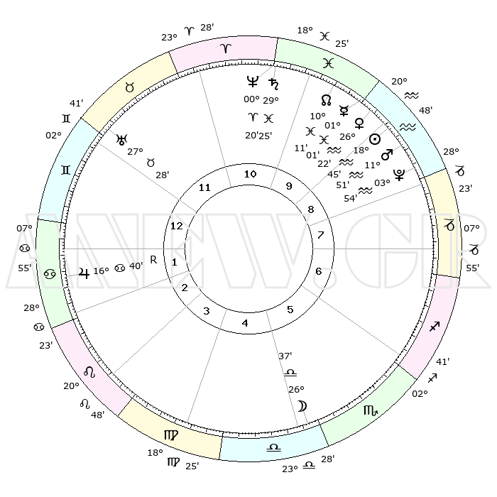 | | ΘΕΣΕΙΣ ΠΛΑΝΗΤΩΝ ΑΣΤΡΟΛΟΓΙΚΟΥ ΧΑΡΤΗ ΤΗΣ ΣΤΙΓΜΗΣ ΑΥΤΗΣ | | | | Πλανήτης | Ζώδιο | Μοίρες | Δεκαήμ. | Σε οίκο | Απόκλιση | | Ακμές των οίκων | | Ηλιος | Υδροχόος | 18°40' | Δεύτερο | 9 | 15 S 14 | | 1ος | 13°42' | Δίδυμοι | | Σελήνη | Ζυγός | 25°45' | Τρίτο | 5 | 13 S 30 | | 2ος | 06°08' | Καρκίνος | | Ερμής | Ιχθείς | 00°54' | Πρώτο | 10 | 12 S 21 | | 3ος | 27°21' | Καρκίνος | | Αφροδίτη | Υδροχόος | 26°17' | Τρίτο | 10 | 14 S 06 | | 4ος | 21°24' | Λέων | | Αρης | Υδροχόος | 11°48' | Δεύτερο | 9 | 18 S 16 | | 5ος | 22°23' | Παρθένος | | Δίας | Καρκίνος | 16°41'R | Δεύτερο | 2 | 22 N 42 | | 6ος | 02°25' | Σκορπιός | | Κρόνος | Ιχθείς | 29°25' | Τρίτο | 11 | 02 S 13 | | 7ος | 13°42' | Τοξότης | | Ουρανός | Ταύρος | 27°28' | Τρίτο | 12 | 19 N 24 | | 8ος | 06°08' | Αιγόκερως | | Ποσειδώνας | Κριός | 00°20' | Πρώτο | 11 | 01 S 04 | | 9ος | 27°21' | Αιγόκερως | | Πλούτωνας | Υδροχόος | 03°54' | Πρώτο | 9 | 22 S 59 | | 10ος | 21°24' | Υδροχόος | | Β. Δεσμός | Ιχθείς | 10°11' | Δεύτερο | 10 | 07 S 45 | | 11ος | 22°23' | Ιχθείς | | Ωροσκόπος | Δίδυμοι | 13°42' | Δεύτερο | | | 12ος | 02°25' | Ταύρος | | Μεσουράνημα | Υδροχόος | 21°24' | Τρίτο | | | |
