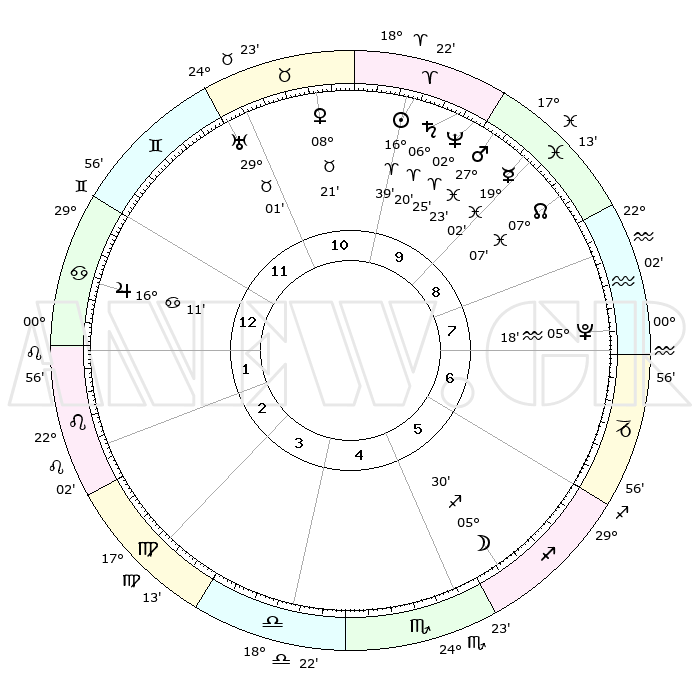 | | ΘΕΣΕΙΣ ΠΛΑΝΗΤΩΝ ΑΣΤΡΟΛΟΓΙΚΟΥ ΧΑΡΤΗ ΤΗΣ ΣΤΙΓΜΗΣ ΑΥΤΗΣ | | | | Πλανήτης | Ζώδιο | Μοίρες | Δεκαήμ. | Σε οίκο | Απόκλιση | | Ακμές των οίκων | | Ηλιος | Κριός | 16°35' | Δεύτερο | 10 | 06 N 31 | | 1ος | 13°45' | Καρκίνος | | Σελήνη | Τοξότης | 04°49' | Πρώτο | 5 | 26 S 10 | | 2ος | 04°11' | Λέων | | Ερμής | Ιχθείς | 18°58' | Δεύτερο | 9 | 06 S 13 | | 3ος | 27°11' | Λέων | | Αφροδίτη | Ταύρος | 08°16' | Πρώτο | 11 | 14 N 03 | | 4ος | 25°47' | Παρθένος | | Αρης | Ιχθείς | 27°20' | Τρίτο | 10 | 02 S 00 | | 5ος | 01°25' | Σκορπιός | | Δίας | Καρκίνος | 16°10' | Δεύτερο | 1 | 22 N 50 | | 6ος | 09°49' | Τοξότης | | Κρόνος | Κριός | 06°20' | Πρώτο | 10 | 00 N 33 | | 7ος | 13°45' | Αιγόκερως | | Ουρανός | Ταύρος | 29°00' | Τρίτο | 11 | 19 N 46 | | 8ος | 04°11' | Υδροχόος | | Ποσειδώνας | Κριός | 02°25' | Πρώτο | 10 | 00 S 15 | | 9ος | 27°11' | Υδροχόος | | Πλούτωνας | Υδροχόος | 05°18' | Πρώτο | 8 | 22 S 47 | | 10ος | 25°47' | Ιχθείς | | Β. Δεσμός | Ιχθείς | 07°07' | Πρώτο | 9 | 08 S 54 | | 11ος | 01°25' | Ταύρος | | Ωροσκόπος | Καρκίνος | 13°45' | Δεύτερο | | | 12ος | 09°49' | Δίδυμοι | | Μεσουράνημα | Ιχθείς | 25°47' | Τρίτο | | | |