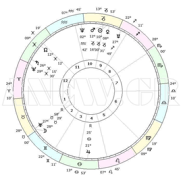 | | ΘΕΣΕΙΣ ΠΛΑΝΗΤΩΝ ΑΣΤΡΟΛΟΓΙΚΟΥ ΧΑΡΤΗ ΤΗΣ ΣΤΙΓΜΗΣ ΑΥΤΗΣ | | | | Πλανήτης | Ζώδιο | Μοίρες | Δεκαήμ. | Σε οίκο | Απόκλιση | | Ακμές των οίκων | | Ηλιος | Αιγόκερως | 09°56' | Πρώτο | 10 | 23 S 04 | | 1ος | 12°13' | Ιχθείς | | Σελήνη | Ταύρος | 27°25' | Τρίτο | 3 | 24 N 22 | | 2ος | 26°09' | Κριός | | Ερμής | Τοξότης | 27°43' | Τρίτο | 10 | 23 S 55 | | 3ος | 26°33' | Ταύρος | | Αφροδίτη | Αιγόκερως | 08°26' | Πρώτο | 10 | 23 S 39 | | 4ος | 19°54' | Δίδυμοι | | Αρης | Αιγόκερως | 12°13' | Δεύτερο | 11 | 23 S 45 | | 5ος | 11°40' | Καρκίνος | | Δίας | Καρκίνος | 21°26'R | Τρίτο | 5 | 21 N 58 | | 6ος | 06°36' | Λέων | | Κρόνος | Ιχθείς | 26°15' | Τρίτο | 1 | 03 S 34 | | 7ος | 12°13' | Παρθένος | | Ουρανός | Ταύρος | 27°58'R | Τρίτο | 3 | 19 N 30 | | 8ος | 26°09' | Ζυγός | | Ποσειδώνας | Ιχθείς | 29°30' | Τρίτο | 1 | 01 S 25 | | 9ος | 26°33' | Σκορπιός | | Πλούτωνας | Υδροχόος | 02°42' | Πρώτο | 11 | 23 S 13 | | 10ος | 19°54' | Τοξότης | | Β. Δεσμός | Ιχθείς | 12°12' | Δεύτερο | 12 | 06 S 59 | | 11ος | 11°40' | Αιγόκερως | | Ωροσκόπος | Ιχθείς | 12°13' | Δεύτερο | | | 12ος | 06°36' | Υδροχόος | | Μεσουράνημα | Τοξότης | 19°54' | Δεύτερο | | | |