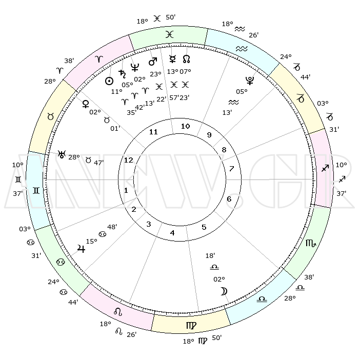| | ΘΕΣΕΙΣ ΠΛΑΝΗΤΩΝ ΑΣΤΡΟΛΟΓΙΚΟΥ ΧΑΡΤΗ ΤΗΣ ΣΤΙΓΜΗΣ ΑΥΤΗΣ | | | | Πλανήτης | Ζώδιο | Μοίρες | Δεκαήμ. | Σε οίκο | Απόκλιση | | Ακμές των οίκων | | Ηλιος | Κριός | 11°31' | Δεύτερο | 12 | 04 N 33 | | 1ος | 14°04' | Ταύρος | | Σελήνη | Ζυγός | 01°31' | Πρώτο | 6 | 02 S 27 | | 2ος | 12°32' | Δίδυμοι | | Ερμής | Ιχθείς | 13°54' | Δεύτερο | 11 | 07 S 34 | | 3ος | 04°51' | Καρκίνος | | Αφροδίτη | Ταύρος | 01°57' | Πρώτο | 12 | 11 N 44 | | 4ος | 26°47' | Καρκίνος | | Αρης | Ιχθείς | 23°19' | Τρίτο | 11 | 03 S 37 | | 5ος | 22°48' | Λέων | | Δίας | Καρκίνος | 15°48' | Δεύτερο | 3 | 22 N 52 | | 6ος | 28°20' | Παρθένος | | Κρόνος | Κριός | 05°41' | Πρώτο | 12 | 00 N 18 | | 7ος | 14°04' | Σκορπιός | | Ουρανός | Ταύρος | 28°46' | Τρίτο | 1 | 19 N 43 | | 8ος | 12°32' | Τοξότης | | Ποσειδώνας | Κριός | 02°13' | Πρώτο | 12 | 00 S 19 | | 9ος | 04°51' | Αιγόκερως | | Πλούτωνας | Υδροχόος | 05°13' | Πρώτο | 10 | 22 S 47 | | 10ος | 26°47' | Αιγόκερως | | Β. Δεσμός | Ιχθείς | 07°23' | Πρώτο | 11 | 08 S 48 | | 11ος | 22°48' | Υδροχόος | | Ωροσκόπος | Ταύρος | 14°04' | Δεύτερο | | | 12ος | 28°20' | Ιχθείς | | Μεσουράνημα | Αιγόκερως | 26°47' | Τρίτο | | | |