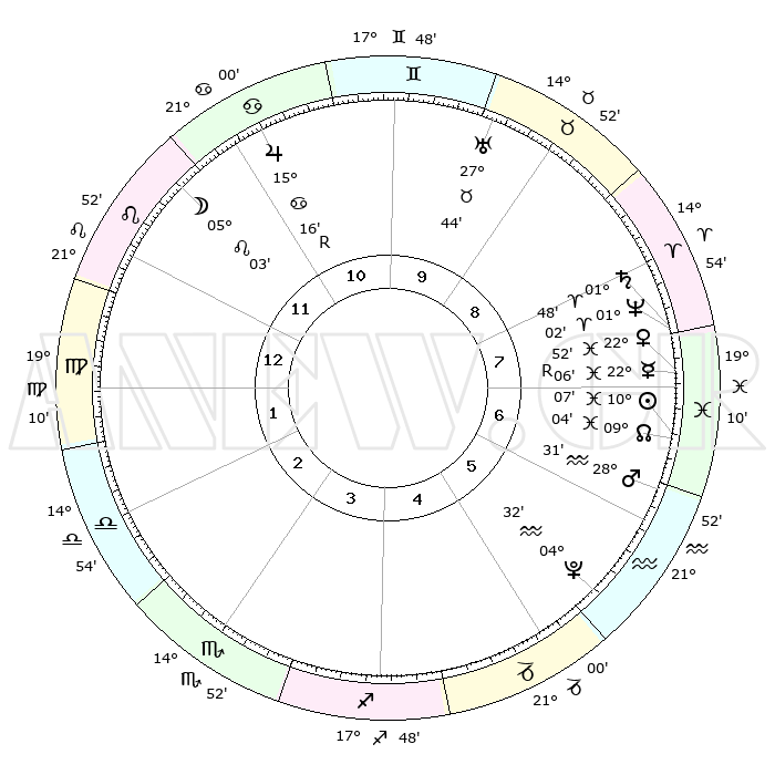 | | ΘΕΣΕΙΣ ΠΛΑΝΗΤΩΝ ΑΣΤΡΟΛΟΓΙΚΟΥ ΧΑΡΤΗ ΤΗΣ ΣΤΙΓΜΗΣ ΑΥΤΗΣ | | | | Πλανήτης | Ζώδιο | Μοίρες | Δεκαήμ. | Σε οίκο | Απόκλιση | | Ακμές των οίκων | | Ηλιος | Ιχθείς | 10°04' | Δεύτερο | 7 | 07 S 48 | | 1ος | 03°05' | Παρθένος | | Σελήνη | Λέων | 04°17' | Πρώτο | 11 | 22 N 06 | | 2ος | 27°16' | Παρθένος | | Ερμής | Ιχθείς | 22°07'R | Τρίτο | 7 | 00 S 09 | | 3ος | 26°12' | Ζυγός | | Αφροδίτη | Ιχθείς | 22°48' | Τρίτο | 7 | 04 S 07 | | 4ος | 29°09' | Σκορπιός | | Αρης | Υδροχόος | 28°29' | Τρίτο | 6 | 13 S 02 | | 5ος | 03°08' | Αιγόκερως | | Δίας | Καρκίνος | 15°16'R | Δεύτερο | 11 | 22 N 54 | | 6ος | 04°52' | Υδροχόος | | Κρόνος | Κριός | 01°48' | Πρώτο | 8 | 01 S 15 | | 7ος | 03°05' | Ιχθείς | | Ουρανός | Ταύρος | 27°44' | Τρίτο | 9 | 19 N 28 | | 8ος | 27°16' | Ιχθείς | | Ποσειδώνας | Κριός | 01°02' | Πρώτο | 8 | 00 S 47 | | 9ος | 26°12' | Κριός | | Πλούτωνας | Υδροχόος | 04°32' | Πρώτο | 5 | 22 S 53 | | 10ος | 29°09' | Ταύρος | | Β. Δεσμός | Ιχθείς | 09°04' | Πρώτο | 7 | 08 S 10 | | 11ος | 03°08' | Καρκίνος | | Ωροσκόπος | Παρθένος | 03°05' | Πρώτο | | | 12ος | 04°52' | Λέων | | Μεσουράνημα | Ταύρος | 29°09' | Τρίτο | | | |
