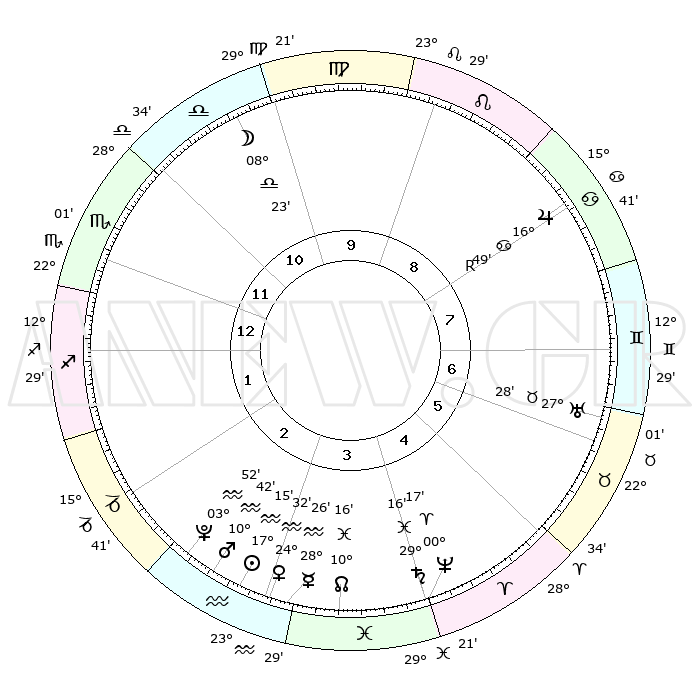 | | ΘΕΣΕΙΣ ΠΛΑΝΗΤΩΝ ΑΣΤΡΟΛΟΓΙΚΟΥ ΧΑΡΤΗ ΤΗΣ ΣΤΙΓΜΗΣ ΑΥΤΗΣ | | | | Πλανήτης | Ζώδιο | Μοίρες | Δεκαήμ. | Σε οίκο | Απόκλιση | | Ακμές των οίκων | | Ηλιος | Υδροχόος | 17°11' | Δεύτερο | 3 | 15 S 41 | | 1ος | 23°51' | Σκορπιός | | Σελήνη | Ζυγός | 07°35' | Πρώτο | 11 | 05 S 19 | | 2ος | 24°12' | Τοξότης | | Ερμής | Υδροχόος | 28°19' | Τρίτο | 3 | 13 S 25 | | 3ος | 28°56' | Αιγόκερως | | Αφροδίτη | Υδροχόος | 24°27' | Τρίτο | 3 | 14 S 43 | | 4ος | 04°45' | Ιχθείς | | Αρης | Υδροχόος | 10°39' | Δεύτερο | 3 | 18 S 35 | | 5ος | 06°28' | Κριός | | Δίας | Καρκίνος | 16°50'R | Δεύτερο | 8 | 22 N 41 | | 6ος | 02°21' | Ταύρος | | Κρόνος | Ιχθείς | 29°16' | Τρίτο | 4 | 02 S 17 | | 7ος | 23°51' | Ταύρος | | Ουρανός | Ταύρος | 27°28' | Τρίτο | 7 | 19 N 24 | | 8ος | 24°12' | Δίδυμοι | | Ποσειδώνας | Κριός | 00°17' | Πρώτο | 4 | 01 S 05 | | 9ος | 28°56' | Καρκίνος | | Πλούτωνας | Υδροχόος | 03°52' | Πρώτο | 3 | 23 S 00 | | 10ος | 04°45' | Παρθένος | | Β. Δεσμός | Ιχθείς | 10°16' | Δεύτερο | 4 | 07 S 43 | | 11ος | 06°28' | Ζυγός | | Ωροσκόπος | Σκορπιός | 23°51' | Τρίτο | | | 12ος | 02°21' | Σκορπιός | | Μεσουράνημα | Παρθένος | 04°45' | Πρώτο | | | |