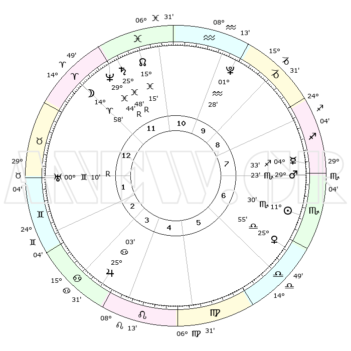 | | ΘΕΣΕΙΣ ΠΛΑΝΗΤΩΝ ΑΣΤΡΟΛΟΓΙΚΟΥ ΧΑΡΤΗ ΤΗΣ ΣΤΙΓΜΗΣ ΑΥΤΗΣ | | | | Πλανήτης | Ζώδιο | Μοίρες | Δεκαήμ. | Σε οίκο | Απόκλιση | | Ακμές των οίκων | | Ηλιος | Σκορπιός | 11°12' | Δεύτερο | 10 | 15 S 11 | | 1ος | 04°32' | Αιγόκερως | | Σελήνη | Κριός | 10°37' | Δεύτερο | 3 | 06 N 05 | | 2ος | 12°50' | Υδροχόος | | Ερμής | Τοξότης | 04°20' | Πρώτο | 11 | 23 S 50 | | 3ος | 23°04' | Ιχθείς | | Αφροδίτη | Ζυγός | 25°33' | Τρίτο | 9 | 08 S 32 | | 4ος | 26°15' | Κριός | | Αρης | Σκορπιός | 29°11' | Τρίτο | 11 | 20 S 23 | | 5ος | 21°52' | Ταύρος | | Δίας | Καρκίνος | 25°02' | Τρίτο | 7 | 21 N 12 | | 6ος | 13°25' | Δίδυμοι | | Κρόνος | Ιχθείς | 25°49'R | Τρίτο | 3 | 03 S 55 | | 7ος | 04°32' | Καρκίνος | | Ουρανός | Δίδυμοι | 00°11'R | Πρώτο | 5 | 19 N 59 | | 8ος | 12°50' | Λέων | | Ποσειδώνας | Ιχθείς | 29°45'R | Τρίτο | 3 | 01 S 21 | | 9ος | 23°04' | Παρθένος | | Πλούτωνας | Υδροχόος | 01°28' | Πρώτο | 1 | 23 S 30 | | 10ος | 26°15' | Ζυγός | | Β. Δεσμός | Ιχθείς | 15°16' | Δεύτερο | 2 | 05 S 48 | | 11ος | 21°52' | Σκορπιός | | Ωροσκόπος | Αιγόκερως | 04°32' | Πρώτο | | | 12ος | 13°25' | Τοξότης | | Μεσουράνημα | Ζυγός | 26°15' | Τρίτο | | | |