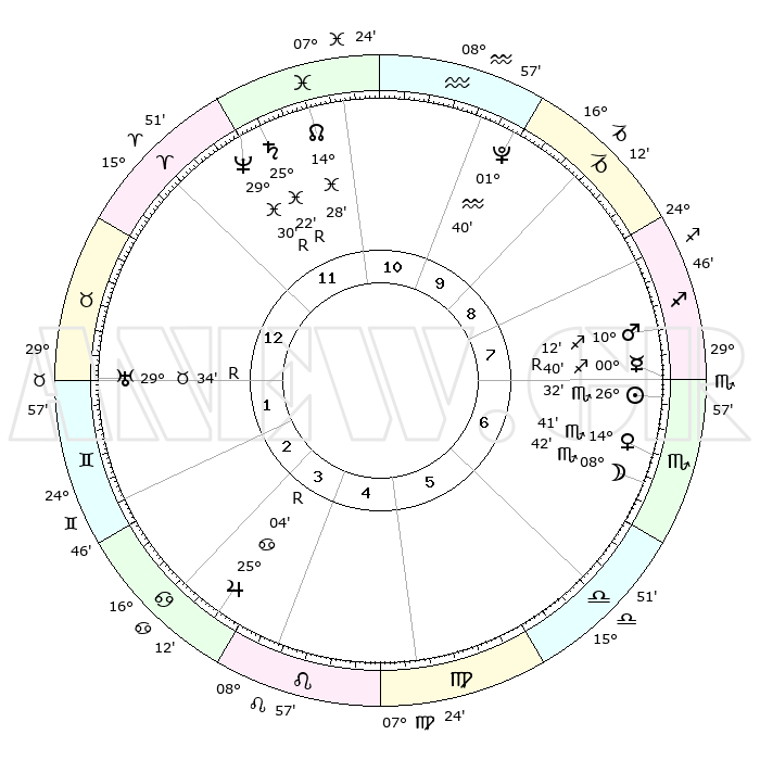 | | ΘΕΣΕΙΣ ΠΛΑΝΗΤΩΝ ΑΣΤΡΟΛΟΓΙΚΟΥ ΧΑΡΤΗ ΤΗΣ ΣΤΙΓΜΗΣ ΑΥΤΗΣ | | | | Πλανήτης | Ζώδιο | Μοίρες | Δεκαήμ. | Σε οίκο | Απόκλιση | | Ακμές των οίκων | | Ηλιος | Σκορπιός | 26°29' | Τρίτο | 7 | 19 S 22 | | 1ος | 04°16' | Ταύρος | | Σελήνη | Σκορπιός | 08°03' | Πρώτο | 7 | 17 S 57 | | 2ος | 05°19' | Δίδυμοι | | Ερμής | Τοξότης | 00°44'R | Πρώτο | 7 | 20 S 22 | | 3ος | 28°28' | Δίδυμοι | | Αφροδίτη | Σκορπιός | 14°37' | Δεύτερο | 7 | 15 S 09 | | 4ος | 20°11' | Καρκίνος | | Αρης | Τοξότης | 10°10' | Δεύτερο | 8 | 22 S 31 | | 5ος | 15°01' | Λέων | | Δίας | Καρκίνος | 25°04'R | Τρίτο | 4 | 21 N 14 | | 6ος | 18°35' | Παρθένος | | Κρόνος | Ιχθείς | 25°22'R | Τρίτο | 12 | 04 S 03 | | 7ος | 04°16' | Σκορπιός | | Ουρανός | Ταύρος | 29°34'R | Τρίτο | 1 | 19 N 51 | | 8ος | 05°19' | Τοξότης | | Ποσειδώνας | Ιχθείς | 29°30'R | Τρίτο | 12 | 01 S 27 | | 9ος | 28°28' | Τοξότης | | Πλούτωνας | Υδροχόος | 01°40' | Πρώτο | 10 | 23 S 27 | | 10ος | 20°11' | Αιγόκερως | | Β. Δεσμός | Ιχθείς | 14°28' | Δεύτερο | 11 | 06 S 07 | | 11ος | 15°01' | Υδροχόος | | Ωροσκόπος | Ταύρος | 04°16' | Πρώτο | | | 12ος | 18°35' | Ιχθείς | | Μεσουράνημα | Αιγόκερως | 20°11' | Τρίτο | | | |