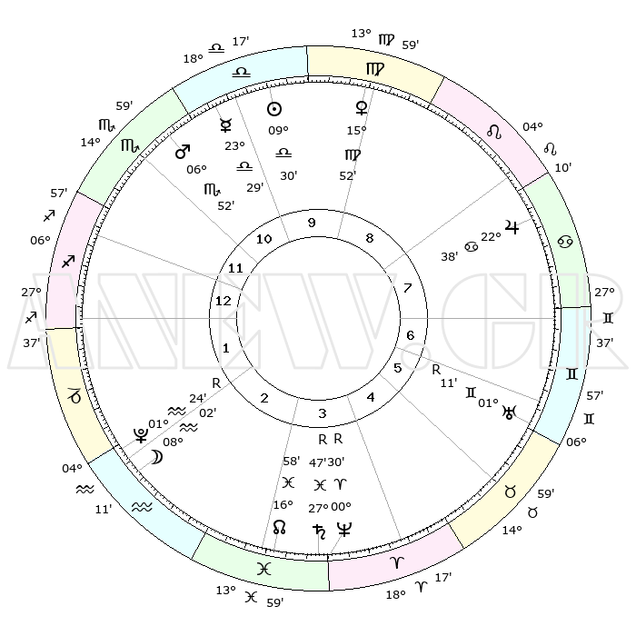 | ΘΕΣΕΙΣ ΠΛΑΝΗΤΩΝ ΑΣΤΡΟΛΟΓΙΚΟΥ ΧΑΡΤΗ ΤΗΣ ΣΤΙΓΜΗΣ ΑΥΤΗΣ | | Πλανήτης | Ζώδιο | Μοίρες | Δεκαήμ. | Σε οίκο | Απόκλιση | | Ακμές των οίκων | Ηλιος | Ζυγός | 09°26' | Πρώτο | 10 | 03 S 44 | | 1ος | 06°23' | Τοξότης | Σελήνη | Υδροχόος | 07°08' | Πρώτο | 2 | 21 S 50 | | 2ος | 08°29' | Αιγόκερως | Ερμής | Ζυγός | 23°23' | Τρίτο | 11 | 09 S 20 | | 3ος | 15°16' | Υδροχόος | Αφροδίτη | Παρθένος | 15°47' | Δεύτερο | 9 | 06 N 49 | | 4ος | 21°21' | Ιχθείς | Αρης | Σκορπιός | 06°49' | Πρώτο | 11 | 13 S 52 | | 5ος | 21°31' | Κριός | Δίας | Καρκίνος | 22°38' | Τρίτο | 8 | 21 N 33 | | 6ος | 15°43' | Ταύρος | Κρόνος | Ιχθείς | 27°47'R | Τρίτο | 4 | 03 S 11 | | 7ος | 06°23' | Δίδυμοι | Ουρανός | Δίδυμοι | 01°11'R | Πρώτο | 6 | 20 N 11 | | 8ος | 08°29' | Καρκίνος | Ποσειδώνας | Κριός | 00°31'R | Πρώτο | 4 | 01 S 04 | | 9ος | 15°16' | Λέων | Πλούτωνας | Υδροχόος | 01°24'R | Πρώτο | 2 | 23 S 32 | | 10ος | 21°21' | Παρθένος | Β. Δεσμός | Ιχθείς | 16°58' | Δεύτερο | 3 | 05 S 09 | | 11ος | 21°31' | Ζυγός | Ωροσκόπος | Τοξότης | 06°23' | Πρώτο | | | 12ος | 15°43' | Σκορπιός | Μεσουράνημα | Παρθένος | 21°21' | Τρίτο | | | |