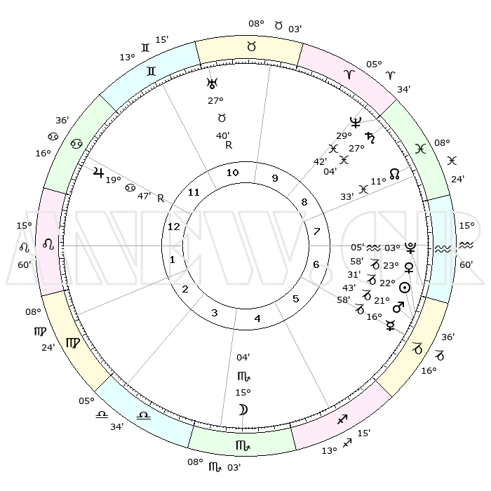 | | ΘΕΣΕΙΣ ΠΛΑΝΗΤΩΝ ΑΣΤΡΟΛΟΓΙΚΟΥ ΧΑΡΤΗ ΤΗΣ ΣΤΙΓΜΗΣ ΑΥΤΗΣ | | | | Πλανήτης | Ζώδιο | Μοίρες | Δεκαήμ. | Σε οίκο | Απόκλιση | | Ακμές των οίκων | | Ηλιος | Αιγόκερως | 22°25' | Τρίτο | 7 | 21 S 34 | | 1ος | 19°23' | Καρκίνος | | Σελήνη | Σκορπιός | 13°60' | Δεύτερο | 5 | 20 S 25 | | 2ος | 09°54' | Λέων | | Ερμής | Αιγόκερως | 16°49' | Δεύτερο | 6 | 24 S 00 | | 3ος | 03°34' | Παρθένος | | Αφροδίτη | Αιγόκερως | 23°51' | Τρίτο | 7 | 22 S 13 | | 4ος | 03°05' | Ζυγός | | Αρης | Αιγόκερως | 21°39' | Τρίτο | 7 | 22 S 38 | | 5ος | 09°03' | Σκορπιός | | Δίας | Καρκίνος | 19°48'R | Δεύτερο | 1 | 22 N 14 | | 6ος | 16°33' | Τοξότης | | Κρόνος | Ιχθείς | 27°04' | Τρίτο | 9 | 03 S 12 | | 7ος | 19°23' | Αιγόκερως | | Ουρανός | Ταύρος | 27°40'R | Τρίτο | 11 | 19 N 27 | | 8ος | 09°54' | Υδροχόος | | Ποσειδώνας | Ιχθείς | 29°41' | Τρίτο | 9 | 01 S 20 | | 9ος | 03°34' | Ιχθείς | | Πλούτωνας | Υδροχόος | 03°05' | Πρώτο | 7 | 23 S 09 | | 10ος | 03°05' | Κριός | | Β. Δεσμός | Ιχθείς | 11°33' | Δεύτερο | 9 | 07 S 14 | | 11ος | 09°03' | Ταύρος | | Ωροσκόπος | Καρκίνος | 19°23' | Δεύτερο | | | 12ος | 16°33' | Δίδυμοι | | Μεσουράνημα | Κριός | 03°05' | Πρώτο | | | |
