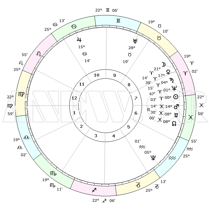 | | ΘΕΣΕΙΣ ΠΛΑΝΗΤΩΝ ΑΣΤΡΟΛΟΓΙΚΟΥ ΧΑΡΤΗ ΤΗΣ ΣΤΙΓΜΗΣ ΑΥΤΗΣ | | | | Πλανήτης | Ζώδιο | Μοίρες | Δεκαήμ. | Σε οίκο | Απόκλιση | | Ακμές των οίκων | | Ηλιος | Ιχθείς | 29°59' | Τρίτο | 8 | 00 S 00 | | 1ος | 01°36' | Παρθένος | | Σελήνη | Κριός | 20°11' | Τρίτο | 8 | 11 N 06 | | 2ος | 25°37' | Παρθένος | | Ερμής | Ιχθείς | 08°30'R | Πρώτο | 7 | 07 S 25 | | 3ος | 24°26' | Ζυγός | | Αφροδίτη | Κριός | 17°34' | Δεύτερο | 8 | 06 N 05 | | 4ος | 27°22' | Σκορπιός | | Αρης | Ιχθείς | 14°11' | Δεύτερο | 7 | 07 S 13 | | 5ος | 01°27' | Αιγόκερως | | Δίας | Καρκίνος | 15°14' | Δεύτερο | 11 | 22 N 55 | | 6ος | 03°17' | Υδροχόος | | Κρόνος | Κριός | 04°14' | Πρώτο | 8 | 00 S 16 | | 7ος | 01°36' | Ιχθείς | | Ουρανός | Ταύρος | 28°18' | Τρίτο | 10 | 19 N 36 | | 8ος | 25°37' | Ιχθείς | | Ποσειδώνας | Κριός | 01°47' | Πρώτο | 8 | 00 S 30 | | 9ος | 24°26' | Κριός | | Πλούτωνας | Υδροχόος | 05°00' | Πρώτο | 6 | 22 S 49 | | 10ος | 27°22' | Ταύρος | | Β. Δεσμός | Ιχθείς | 08°00' | Πρώτο | 7 | 08 S 34 | | 11ος | 01°27' | Καρκίνος | | Ωροσκόπος | Παρθένος | 01°36' | Πρώτο | | | 12ος | 03°17' | Λέων | | Μεσουράνημα | Ταύρος | 27°22' | Τρίτο | | | |