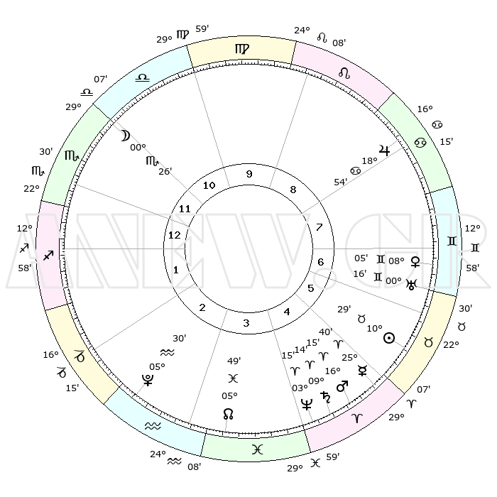 | | ΘΕΣΕΙΣ ΠΛΑΝΗΤΩΝ ΑΣΤΡΟΛΟΓΙΚΟΥ ΧΑΡΤΗ ΤΗΣ ΣΤΙΓΜΗΣ ΑΥΤΗΣ | | | | Πλανήτης | Ζώδιο | Μοίρες | Δεκαήμ. | Σε οίκο | Απόκλιση | | Ακμές των οίκων | | Ηλιος | Ταύρος | 10°26' | Δεύτερο | 6 | 14 N 57 | | 1ος | 29°22' | Σκορπιός | | Σελήνη | Ζυγός | 29°52' | Τρίτο | 11 | 15 S 11 | | 2ος | 00°24' | Αιγόκερως | | Ερμής | Κριός | 25°35' | Τρίτο | 5 | 08 N 04 | | 3ος | 06°00' | Υδροχόος | | Αφροδίτη | Δίδυμοι | 08°02' | Πρώτο | 7 | 22 N 31 | | 4ος | 12°02' | Ιχθείς | | Αρης | Κριός | 16°13' | Δεύτερο | 5 | 05 N 33 | | 5ος | 13°09' | Κριός | | Δίας | Καρκίνος | 18°53' | Δεύτερο | 8 | 22 N 29 | | 6ος | 08°17' | Ταύρος | | Κρόνος | Κριός | 09°14' | Πρώτο | 4 | 01 N 40 | | 7ος | 29°22' | Ταύρος | | Ουρανός | Δίδυμοι | 00°16' | Πρώτο | 7 | 20 N 02 | | 8ος | 00°24' | Καρκίνος | | Ποσειδώνας | Κριός | 03°15' | Πρώτο | 4 | 00 N 05 | | 9ος | 06°00' | Λέων | | Πλούτωνας | Υδροχόος | 05°30' | Πρώτο | 2 | 22 S 49 | | 10ος | 12°02' | Παρθένος | | Β. Δεσμός | Ιχθείς | 05°50' | Πρώτο | 3 | 09 S 22 | | 11ος | 13°09' | Ζυγός | | Ωροσκόπος | Σκορπιός | 29°22' | Τρίτο | | | 12ος | 08°17' | Σκορπιός | | Μεσουράνημα | Παρθένος | 12°02' | Δεύτερο | | | |