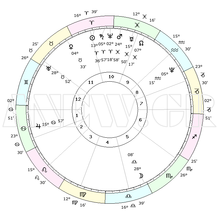 | | ΘΕΣΕΙΣ ΠΛΑΝΗΤΩΝ ΑΣΤΡΟΛΟΓΙΚΟΥ ΧΑΡΤΗ ΤΗΣ ΣΤΙΓΜΗΣ ΑΥΤΗΣ | | | | Πλανήτης | Ζώδιο | Μοίρες | Δεκαήμ. | Σε οίκο | Απόκλιση | | Ακμές των οίκων | | Ηλιος | Κριός | 13°32' | Δεύτερο | 11 | 05 N 20 | | 1ος | 05°55' | Δίδυμοι | | Σελήνη | Ζυγός | 27°13' | Τρίτο | 6 | 14 S 06 | | 2ος | 29°36' | Δίδυμοι | | Ερμής | Ιχθείς | 15°46' | Δεύτερο | 11 | 07 S 07 | | 3ος | 20°52' | Καρκίνος | | Αφροδίτη | Ταύρος | 04°27' | Πρώτο | 12 | 12 N 41 | | 4ος | 14°07' | Λέων | | Αρης | Ιχθείς | 24°55' | Τρίτο | 11 | 02 S 58 | | 5ος | 13°38' | Παρθένος | | Δίας | Καρκίνος | 15°56' | Δεύτερο | 2 | 22 N 51 | | 6ος | 22°55' | Ζυγός | | Κρόνος | Κριός | 05°57' | Πρώτο | 11 | 00 N 24 | | 7ος | 05°55' | Τοξότης | | Ουρανός | Ταύρος | 28°52' | Τρίτο | 12 | 19 N 44 | | 8ος | 29°36' | Τοξότης | | Ποσειδώνας | Κριός | 02°18' | Πρώτο | 11 | 00 S 17 | | 9ος | 20°52' | Αιγόκερως | | Πλούτωνας | Υδροχόος | 05°15' | Πρώτο | 9 | 22 S 47 | | 10ος | 14°07' | Υδροχόος | | Β. Δεσμός | Ιχθείς | 07°17' | Πρώτο | 10 | 08 S 50 | | 11ος | 13°38' | Ιχθείς | | Ωροσκόπος | Δίδυμοι | 05°55' | Πρώτο | | | 12ος | 22°55' | Κριός | | Μεσουράνημα | Υδροχόος | 14°07' | Δεύτερο | | | |