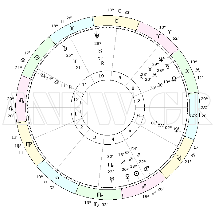 | | ΘΕΣΕΙΣ ΠΛΑΝΗΤΩΝ ΑΣΤΡΟΛΟΓΙΚΟΥ ΧΑΡΤΗ ΤΗΣ ΣΤΙΓΜΗΣ ΑΥΤΗΣ | | | | Πλανήτης | Ζώδιο | Μοίρες | Δεκαήμ. | Σε οίκο | Απόκλιση | | Ακμές των οίκων | | Ηλιος | Τοξότης | 13°54' | Δεύτερο | 5 | 22 S 28 | | 1ος | 05°51' | Λέων | | Σελήνη | Δίδυμοι | 25°35' | Τρίτο | 11 | 28 N 15 | | 2ος | 27°20' | Λέων | | Ερμής | Σκορπιός | 23°29' | Τρίτο | 4 | 16 S 14 | | 3ος | 23°11' | Παρθένος | | Αφροδίτη | Τοξότης | 06°14' | Πρώτο | 5 | 20 S 50 | | 4ος | 24°52' | Ζυγός | | Αρης | Τοξότης | 22°52' | Τρίτο | 5 | 23 S 57 | | 5ος | 00°42' | Τοξότης | | Δίας | Καρκίνος | 24°12'R | Τρίτο | 12 | 21 N 26 | | 6ος | 05°28' | Αιγόκερως | | Κρόνος | Ιχθείς | 25°20' | Τρίτο | 9 | 04 S 01 | | 7ος | 05°51' | Υδροχόος | | Ουρανός | Ταύρος | 28°51'R | Τρίτο | 10 | 19 N 42 | | 8ος | 27°20' | Υδροχόος | | Ποσειδώνας | Ιχθείς | 29°23'R | Τρίτο | 9 | 01 S 29 | | 9ος | 23°11' | Ιχθείς | | Πλούτωνας | Υδροχόος | 02°01' | Πρώτο | 6 | 23 S 23 | | 10ος | 24°52' | Κριός | | Β. Δεσμός | Ιχθείς | 13°33' | Δεύτερο | 8 | 06 S 28 | | 11ος | 00°42' | Δίδυμοι | | Ωροσκόπος | Λέων | 05°51' | Πρώτο | | | 12ος | 05°28' | Καρκίνος | | Μεσουράνημα | Κριός | 24°52' | Τρίτο | | | |