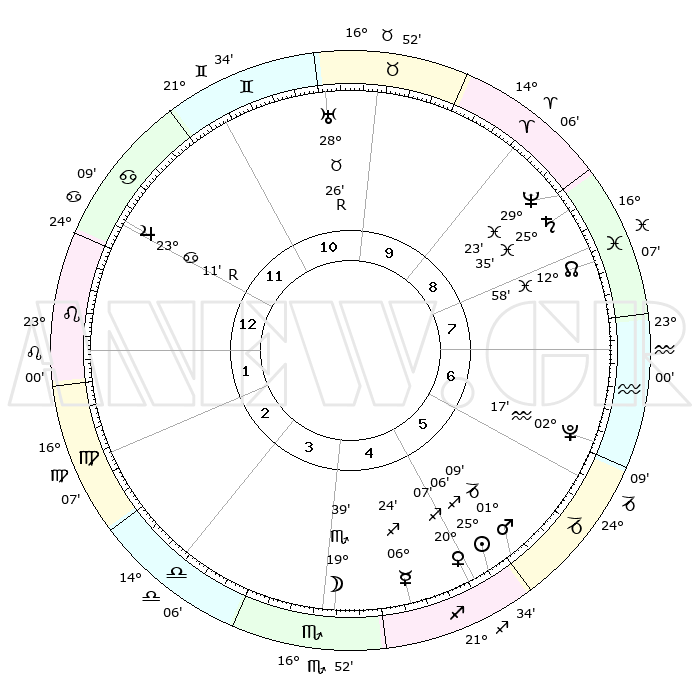 | | ΘΕΣΕΙΣ ΠΛΑΝΗΤΩΝ ΑΣΤΡΟΛΟΓΙΚΟΥ ΧΑΡΤΗ ΤΗΣ ΣΤΙΓΜΗΣ ΑΥΤΗΣ | | | | Πλανήτης | Ζώδιο | Μοίρες | Δεκαήμ. | Σε οίκο | Απόκλιση | | Ακμές των οίκων | | Ηλιος | Τοξότης | 24°45' | Τρίτο | 9 | 23 S 20 | | 1ος | 12°18' | Κριός | | Σελήνη | Σκορπιός | 15°29' | Δεύτερο | 7 | 20 S 44 | | 2ος | 19°25' | Ταύρος | | Ερμής | Τοξότης | 05°55' | Πρώτο | 8 | 19 S 57 | | 3ος | 15°04' | Δίδυμοι | | Αφροδίτη | Τοξότης | 19°40' | Δεύτερο | 9 | 22 S 56 | | 4ος | 06°57' | Καρκίνος | | Αρης | Αιγόκερως | 00°53' | Πρώτο | 9 | 24 S 13 | | 5ος | 29°55' | Καρκίνος | | Δίας | Καρκίνος | 23°13'R | Τρίτο | 4 | 21 N 38 | | 6ος | 29°20' | Λέων | | Κρόνος | Ιχθείς | 25°35' | Τρίτο | 12 | 03 S 53 | | 7ος | 12°18' | Ζυγός | | Ουρανός | Ταύρος | 28°27'R | Τρίτο | 2 | 19 N 37 | | 8ος | 19°25' | Σκορπιός | | Ποσειδώνας | Ιχθείς | 29°23' | Τρίτο | 12 | 01 S 29 | | 9ος | 15°04' | Τοξότης | | Πλούτωνας | Υδροχόος | 02°17' | Πρώτο | 11 | 23 S 19 | | 10ος | 06°57' | Αιγόκερως | | Β. Δεσμός | Ιχθείς | 12°60' | Δεύτερο | 12 | 06 S 41 | | 11ος | 29°55' | Αιγόκερως | | Ωροσκόπος | Κριός | 12°18' | Δεύτερο | | | 12ος | 29°20' | Υδροχόος | | Μεσουράνημα | Αιγόκερως | 06°57' | Πρώτο | | | |