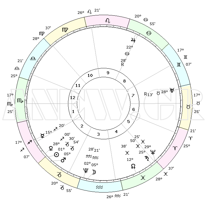 | | ΘΕΣΕΙΣ ΠΛΑΝΗΤΩΝ ΑΣΤΡΟΛΟΓΙΚΟΥ ΧΑΡΤΗ ΤΗΣ ΣΤΙΓΜΗΣ ΑΥΤΗΣ | | | | Πλανήτης | Ζώδιο | Μοίρες | Δεκαήμ. | Σε οίκο | Απόκλιση | | Ακμές των οίκων | | Ηλιος | Αιγόκερως | 01°24' | Πρώτο | 3 | 23 S 26 | | 1ος | 22°25' | Ζυγός | | Σελήνη | Υδροχόος | 04°16' | Πρώτο | 4 | 22 S 08 | | 2ος | 20°23' | Σκορπιός | | Ερμής | Τοξότης | 15°12' | Δεύτερο | 2 | 22 S 06 | | 3ος | 21°49' | Τοξότης | | Αφροδίτη | Τοξότης | 27°54' | Τρίτο | 3 | 23 S 34 | | 4ος | 25°32' | Αιγόκερως | | Αρης | Αιγόκερως | 05°50' | Πρώτο | 3 | 24 S 08 | | 5ος | 28°29' | Υδροχόος | | Δίας | Καρκίνος | 22°29'R | Τρίτο | 9 | 21 N 46 | | 6ος | 27°47' | Ιχθείς | | Κρόνος | Ιχθείς | 25°50' | Τρίτο | 5 | 03 S 46 | | 7ος | 22°25' | Κριός | | Ουρανός | Ταύρος | 28°13'R | Τρίτο | 8 | 19 N 34 | | 8ος | 20°23' | Ταύρος | | Ποσειδώνας | Ιχθείς | 29°25' | Τρίτο | 6 | 01 S 28 | | 9ος | 21°49' | Δίδυμοι | | Πλούτωνας | Υδροχόος | 02°28' | Πρώτο | 4 | 23 S 16 | | 10ος | 25°32' | Καρκίνος | | Β. Δεσμός | Ιχθείς | 12°39' | Δεύτερο | 5 | 06 S 49 | | 11ος | 28°29' | Λέων | | Ωροσκόπος | Ζυγός | 22°25' | Τρίτο | | | 12ος | 27°47' | Παρθένος | | Μεσουράνημα | Καρκίνος | 25°32' | Τρίτο | | | |