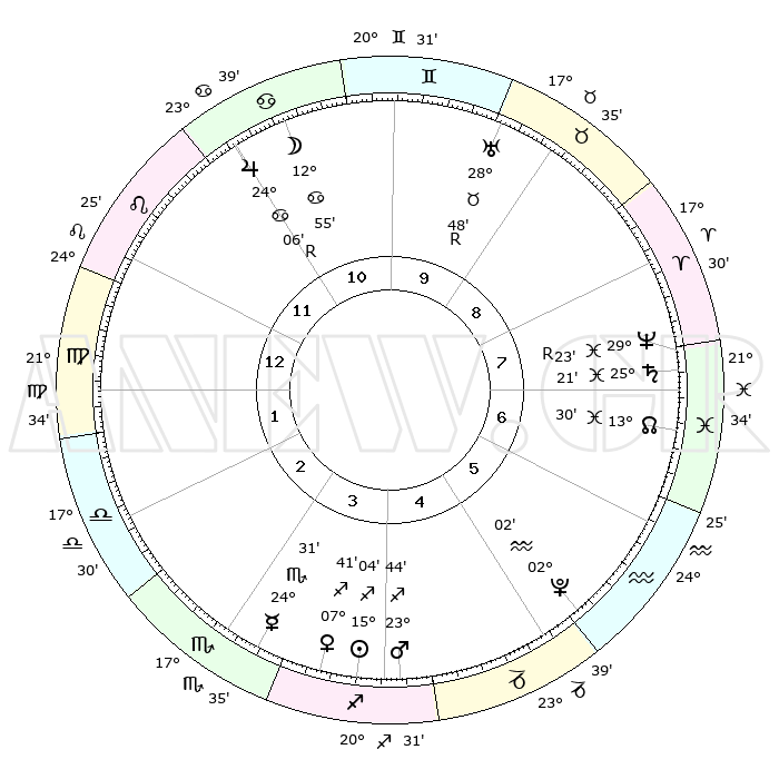 | | ΘΕΣΕΙΣ ΠΛΑΝΗΤΩΝ ΑΣΤΡΟΛΟΓΙΚΟΥ ΧΑΡΤΗ ΤΗΣ ΣΤΙΓΜΗΣ ΑΥΤΗΣ | | | | Πλανήτης | Ζώδιο | Μοίρες | Δεκαήμ. | Σε οίκο | Απόκλιση | | Ακμές των οίκων | | Ηλιος | Τοξότης | 15°01' | Δεύτερο | 4 | 22 S 36 | | 1ος | 08°18' | Παρθένος | | Σελήνη | Καρκίνος | 12°15' | Δεύτερο | 11 | 27 N 14 | | 2ος | 03°01' | Ζυγός | | Ερμής | Σκορπιός | 24°28' | Τρίτο | 3 | 16 S 33 | | 3ος | 02°21' | Σκορπιός | | Αφροδίτη | Τοξότης | 07°38' | Πρώτο | 4 | 21 S 06 | | 4ος | 05°18' | Τοξότης | | Αρης | Τοξότης | 23°42' | Τρίτο | 4 | 24 S 00 | | 5ος | 08°59' | Αιγόκερως | | Δίας | Καρκίνος | 24°06'R | Τρίτο | 11 | 21 N 27 | | 6ος | 10°23' | Υδροχόος | | Κρόνος | Ιχθείς | 25°21' | Τρίτο | 7 | 04 S 00 | | 7ος | 08°18' | Ιχθείς | | Ουρανός | Ταύρος | 28°48'R | Τρίτο | 9 | 19 N 41 | | 8ος | 03°01' | Κριός | | Ποσειδώνας | Ιχθείς | 29°23'R | Τρίτο | 7 | 01 S 29 | | 9ος | 02°21' | Ταύρος | | Πλούτωνας | Υδροχόος | 02°02' | Πρώτο | 5 | 23 S 22 | | 10ος | 05°18' | Δίδυμοι | | Β. Δεσμός | Ιχθείς | 13°30' | Δεύτερο | 7 | 06 S 29 | | 11ος | 08°59' | Καρκίνος | | Ωροσκόπος | Παρθένος | 08°18' | Πρώτο | | | 12ος | 10°23' | Λέων | | Μεσουράνημα | Δίδυμοι | 05°18' | Πρώτο | | | |