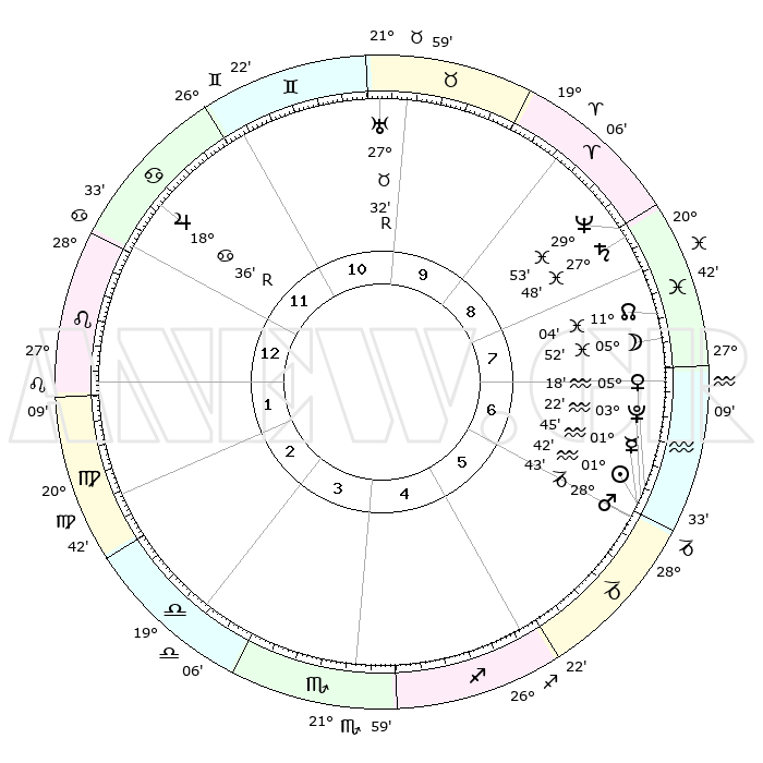 | | ΘΕΣΕΙΣ ΠΛΑΝΗΤΩΝ ΑΣΤΡΟΛΟΓΙΚΟΥ ΧΑΡΤΗ ΤΗΣ ΣΤΙΓΜΗΣ ΑΥΤΗΣ | | | | Πλανήτης | Ζώδιο | Μοίρες | Δεκαήμ. | Σε οίκο | Απόκλιση | | Ακμές των οίκων | | Ηλιος | Υδροχόος | 01°37' | Πρώτο | 6 | 19 S 48 | | 1ος | 05°25' | Λέων | | Σελήνη | Ιχθείς | 04°54' | Πρώτο | 8 | 10 S 05 | | 2ος | 26°51' | Λέων | | Ερμής | Υδροχόος | 01°38' | Πρώτο | 6 | 21 S 48 | | 3ος | 22°38' | Παρθένος | | Αφροδίτη | Υδροχόος | 05°12' | Πρώτο | 6 | 20 S 05 | | 4ος | 24°17' | Ζυγός | | Αρης | Αιγόκερως | 28°40' | Τρίτο | 6 | 21 S 24 | | 5ος | 00°08' | Τοξότης | | Δίας | Καρκίνος | 18°36'R | Δεύτερο | 12 | 22 N 25 | | 6ος | 04°58' | Αιγόκερως | | Κρόνος | Ιχθείς | 27°48' | Τρίτο | 9 | 02 S 54 | | 7ος | 05°25' | Υδροχόος | | Ουρανός | Ταύρος | 27°32'R | Τρίτο | 10 | 19 N 25 | | 8ος | 26°51' | Υδροχόος | | Ποσειδώνας | Ιχθείς | 29°53' | Τρίτο | 9 | 01 S 16 | | 9ος | 22°38' | Ιχθείς | | Πλούτωνας | Υδροχόος | 03°22' | Πρώτο | 6 | 23 S 05 | | 10ος | 24°17' | Κριός | | Β. Δεσμός | Ιχθείς | 11°04' | Δεύτερο | 8 | 07 S 25 | | 11ος | 00°08' | Δίδυμοι | | Ωροσκόπος | Λέων | 05°25' | Πρώτο | | | 12ος | 04°58' | Καρκίνος | | Μεσουράνημα | Κριός | 24°17' | Τρίτο | | | |