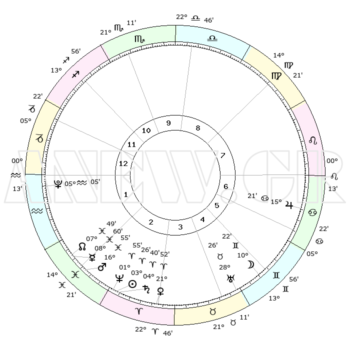 | | ΘΕΣΕΙΣ ΠΛΑΝΗΤΩΝ ΑΣΤΡΟΛΟΓΙΚΟΥ ΧΑΡΤΗ ΤΗΣ ΣΤΙΓΜΗΣ ΑΥΤΗΣ | | | | Πλανήτης | Ζώδιο | Μοίρες | Δεκαήμ. | Σε οίκο | Απόκλιση | | Ακμές των οίκων | | Ηλιος | Κριός | 03°21' | Πρώτο | 3 | 01 N 20 | | 1ος | 01°06' | Αιγόκερως | | Σελήνη | Δίδυμοι | 09°15' | Πρώτο | 5 | 27 N 00 | | 2ος | 08°32' | Υδροχόος | | Ερμής | Ιχθείς | 08°58' | Πρώτο | 2 | 07 S 59 | | 3ος | 18°36' | Ιχθείς | | Αφροδίτη | Κριός | 21°46' | Τρίτο | 3 | 07 N 47 | | 4ος | 22°22' | Κριός | | Αρης | Ιχθείς | 16°51' | Δεύτερο | 2 | 06 S 11 | | 5ος | 18°30' | Ταύρος | | Δίας | Καρκίνος | 15°21' | Δεύτερο | 7 | 22 N 55 | | 6ος | 10°14' | Δίδυμοι | | Κρόνος | Κριός | 04°40' | Πρώτο | 3 | 00 S 06 | | 7ος | 01°06' | Καρκίνος | | Ουρανός | Ταύρος | 28°26' | Τρίτο | 5 | 19 N 38 | | 8ος | 08°32' | Λέων | | Ποσειδώνας | Κριός | 01°54' | Πρώτο | 3 | 00 S 26 | | 9ος | 18°36' | Παρθένος | | Πλούτωνας | Υδροχόος | 05°04' | Πρώτο | 1 | 22 S 48 | | 10ος | 22°22' | Ζυγός | | Β. Δεσμός | Ιχθείς | 07°50' | Πρώτο | 2 | 08 S 38 | | 11ος | 18°30' | Σκορπιός | | Ωροσκόπος | Αιγόκερως | 01°06' | Πρώτο | | | 12ος | 10°14' | Τοξότης | | Μεσουράνημα | Ζυγός | 22°22' | Τρίτο | | | |