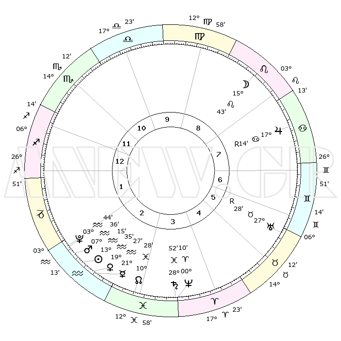 | | ΘΕΣΕΙΣ ΠΛΑΝΗΤΩΝ ΑΣΤΡΟΛΟΓΙΚΟΥ ΧΑΡΤΗ ΤΗΣ ΣΤΙΓΜΗΣ ΑΥΤΗΣ | | | | Πλανήτης | Ζώδιο | Μοίρες | Δεκαήμ. | Σε οίκο | Απόκλιση | | Ακμές των οίκων | | Ηλιος | Υδροχόος | 13°11' | Δεύτερο | 2 | 16 S 51 | | 1ος | 05°29' | Τοξότης | | Σελήνη | Λέων | 14°44' | Δεύτερο | 9 | 18 N 28 | | 2ος | 07°26' | Αιγόκερως | | Ερμής | Υδροχόος | 21°20' | Τρίτο | 3 | 16 S 06 | | 3ος | 14°04' | Υδροχόος | | Αφροδίτη | Υδροχόος | 19°30' | Δεύτερο | 3 | 16 S 17 | | 4ος | 20°09' | Ιχθείς | | Αρης | Υδροχόος | 07°33' | Πρώτο | 2 | 19 S 23 | | 5ος | 20°27' | Κριός | | Δίας | Καρκίνος | 17°14'R | Δεύτερο | 8 | 22 N 38 | | 6ος | 14°46' | Ταύρος | | Κρόνος | Ιχθείς | 28°52' | Τρίτο | 4 | 02 S 27 | | 7ος | 05°29' | Δίδυμοι | | Ουρανός | Ταύρος | 27°28'R | Τρίτο | 6 | 19 N 24 | | 8ος | 07°26' | Καρκίνος | | Ποσειδώνας | Κριός | 00°10' | Πρώτο | 4 | 01 S 08 | | 9ος | 14°04' | Λέων | | Πλούτωνας | Υδροχόος | 03°44' | Πρώτο | 2 | 23 S 01 | | 10ος | 20°09' | Παρθένος | | Β. Δεσμός | Ιχθείς | 10°28' | Δεύτερο | 3 | 07 S 38 | | 11ος | 20°27' | Ζυγός | | Ωροσκόπος | Τοξότης | 05°29' | Πρώτο | | | 12ος | 14°46' | Σκορπιός | | Μεσουράνημα | Παρθένος | 20°09' | Τρίτο | | | |
