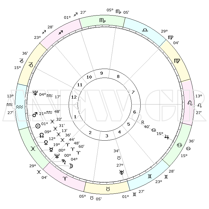 | | ΘΕΣΕΙΣ ΠΛΑΝΗΤΩΝ ΑΣΤΡΟΛΟΓΙΚΟΥ ΧΑΡΤΗ ΤΗΣ ΣΤΙΓΜΗΣ ΑΥΤΗΣ | | | | Πλανήτης | Ζώδιο | Μοίρες | Δεκαήμ. | Σε οίκο | Απόκλιση | | Ακμές των οίκων | | Ηλιος | Ιχθείς | 01°23' | Πρώτο | 2 | 10 S 59 | | 1ος | 18°27' | Τοξότης | | Σελήνη | Κριός | 02°59' | Πρώτο | 3 | 03 N 10 | | 2ος | 22°51' | Αιγόκερως | | Ερμής | Ιχθείς | 19°28' | Δεύτερο | 3 | 03 S 01 | | 3ος | 01°35' | Ιχθείς | | Αφροδίτη | Ιχθείς | 12°02' | Δεύτερο | 3 | 08 S 23 | | 4ος | 07°01' | Κριός | | Αρης | Υδροχόος | 21°41' | Τρίτο | 2 | 15 S 18 | | 5ος | 05°15' | Ταύρος | | Δίας | Καρκίνος | 15°41'R | Δεύτερο | 7 | 22 N 51 | | 6ος | 28°01' | Ταύρος | | Κρόνος | Κριός | 00°47' | Πρώτο | 3 | 01 S 39 | | 7ος | 18°27' | Δίδυμοι | | Ουρανός | Ταύρος | 27°34' | Τρίτο | 5 | 19 N 26 | | 8ος | 22°51' | Καρκίνος | | Ποσειδώνας | Κριός | 00°44' | Πρώτο | 3 | 00 S 55 | | 9ος | 01°35' | Παρθένος | | Πλούτωνας | Υδροχόος | 04°17' | Πρώτο | 2 | 22 S 55 | | 10ος | 07°01' | Ζυγός | | Β. Δεσμός | Ιχθείς | 09°31' | Πρώτο | 3 | 08 S 00 | | 11ος | 05°15' | Σκορπιός | | Ωροσκόπος | Τοξότης | 18°27' | Δεύτερο | | | 12ος | 28°01' | Σκορπιός | | Μεσουράνημα | Ζυγός | 07°01' | Πρώτο | | | |