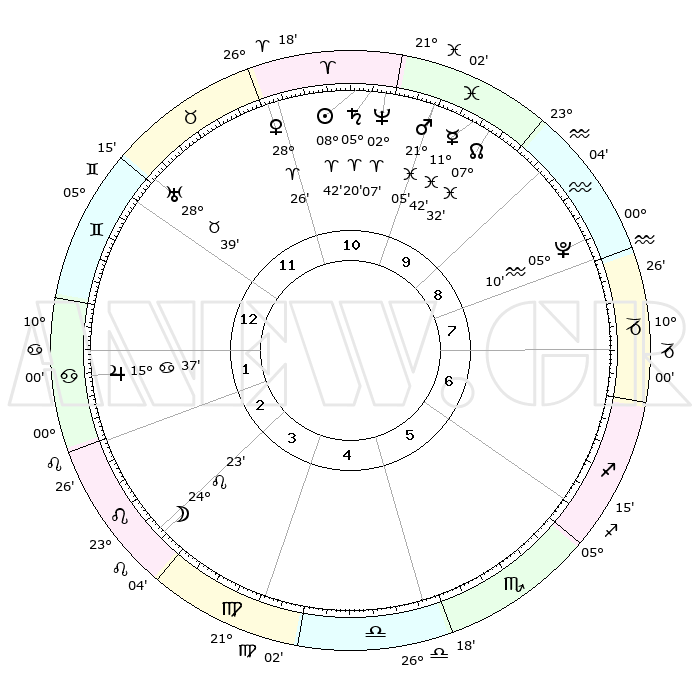 | | ΘΕΣΕΙΣ ΠΛΑΝΗΤΩΝ ΑΣΤΡΟΛΟΓΙΚΟΥ ΧΑΡΤΗ ΤΗΣ ΣΤΙΓΜΗΣ ΑΥΤΗΣ | | | | Πλανήτης | Ζώδιο | Μοίρες | Δεκαήμ. | Σε οίκο | Απόκλιση | | Ακμές των οίκων | | Ηλιος | Κριός | 08°38' | Πρώτο | 11 | 03 N 26 | | 1ος | 17°57' | Δίδυμοι | | Σελήνη | Λέων | 23°30' | Τρίτο | 3 | 14 N 59 | | 2ος | 09°50' | Καρκίνος | | Ερμής | Ιχθείς | 11°39' | Δεύτερο | 10 | 07 S 59 | | 3ος | 01°07' | Λέων | | Αφροδίτη | Κριός | 28°22' | Τρίτο | 11 | 10 N 22 | | 4ος | 25°41' | Λέων | | Αρης | Ιχθείς | 21°02' | Τρίτο | 10 | 04 S 31 | | 5ος | 27°29' | Παρθένος | | Δίας | Καρκίνος | 15°37' | Δεύτερο | 2 | 22 N 53 | | 6ος | 07°44' | Σκορπιός | | Κρόνος | Κριός | 05°20' | Πρώτο | 11 | 00 N 10 | | 7ος | 17°57' | Τοξότης | | Ουρανός | Ταύρος | 28°39' | Τρίτο | 12 | 19 N 41 | | 8ος | 09°50' | Αιγόκερως | | Ποσειδώνας | Κριός | 02°07' | Πρώτο | 11 | 00 S 22 | | 9ος | 01°07' | Υδροχόος | | Πλούτωνας | Υδροχόος | 05°10' | Πρώτο | 9 | 22 S 48 | | 10ος | 25°41' | Υδροχόος | | Β. Δεσμός | Ιχθείς | 07°33' | Πρώτο | 10 | 08 S 44 | | 11ος | 27°29' | Ιχθείς | | Ωροσκόπος | Δίδυμοι | 17°57' | Δεύτερο | | | 12ος | 07°44' | Ταύρος | | Μεσουράνημα | Υδροχόος | 25°41' | Τρίτο | | | |