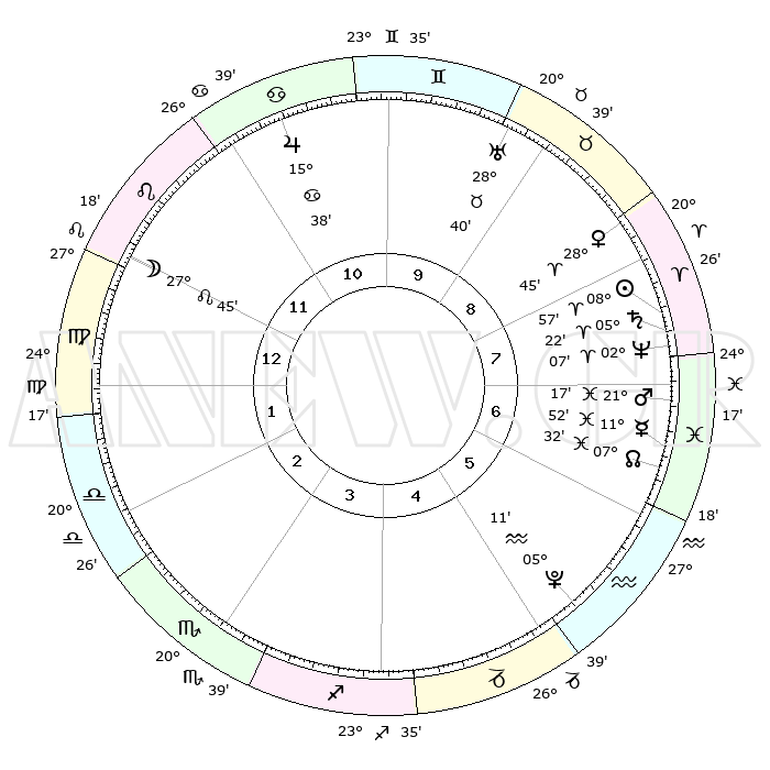 | | ΘΕΣΕΙΣ ΠΛΑΝΗΤΩΝ ΑΣΤΡΟΛΟΓΙΚΟΥ ΧΑΡΤΗ ΤΗΣ ΣΤΙΓΜΗΣ ΑΥΤΗΣ | | | | Πλανήτης | Ζώδιο | Μοίρες | Δεκαήμ. | Σε οίκο | Απόκλιση | | Ακμές των οίκων | | Ηλιος | Κριός | 08°54' | Πρώτο | 8 | 03 N 31 | | 1ος | 05°19' | Παρθένος | | Σελήνη | Λέων | 26°53' | Τρίτο | 12 | 13 N 34 | | 2ος | 29°44' | Παρθένος | | Ερμής | Ιχθείς | 11°49' | Δεύτερο | 7 | 07 S 57 | | 3ος | 28°51' | Ζυγός | | Αφροδίτη | Κριός | 28°40' | Τρίτο | 8 | 10 N 30 | | 4ος | 01°48' | Τοξότης | | Αρης | Ιχθείς | 21°14' | Τρίτο | 7 | 04 S 26 | | 5ος | 05°39' | Αιγόκερως | | Δίας | Καρκίνος | 15°38' | Δεύτερο | 11 | 22 N 53 | | 6ος | 07°13' | Υδροχόος | | Κρόνος | Κριός | 05°22' | Πρώτο | 8 | 00 N 11 | | 7ος | 05°19' | Ιχθείς | | Ουρανός | Ταύρος | 28°40' | Τρίτο | 9 | 19 N 41 | | 8ος | 29°44' | Ιχθείς | | Ποσειδώνας | Κριός | 02°07' | Πρώτο | 8 | 00 S 21 | | 9ος | 28°51' | Κριός | | Πλούτωνας | Υδροχόος | 05°11' | Πρώτο | 5 | 22 S 48 | | 10ος | 01°48' | Δίδυμοι | | Β. Δεσμός | Ιχθείς | 07°32' | Πρώτο | 7 | 08 S 45 | | 11ος | 05°39' | Καρκίνος | | Ωροσκόπος | Παρθένος | 05°19' | Πρώτο | | | 12ος | 07°13' | Λέων | | Μεσουράνημα | Δίδυμοι | 01°48' | Πρώτο | | | |