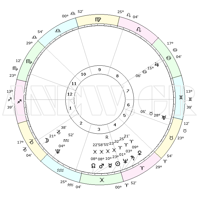 | | ΘΕΣΕΙΣ ΠΛΑΝΗΤΩΝ ΑΣΤΡΟΛΟΓΙΚΟΥ ΧΑΡΤΗ ΤΗΣ ΣΤΙΓΜΗΣ ΑΥΤΗΣ | | | | Πλανήτης | Ζώδιο | Μοίρες | Δεκαήμ. | Σε οίκο | Απόκλιση | | Ακμές των οίκων | | Ηλιος | Ιχθείς | 23°18' | Τρίτο | 4 | 02 S 39 | | 1ος | 20°44' | Σκορπιός | | Σελήνη | Αιγόκερως | 20°41' | Τρίτο | 2 | 25 S 44 | | 2ος | 20°45' | Τοξότης | | Ερμής | Ιχθείς | 10°58'R | Δεύτερο | 4 | 04 S 59 | | 3ος | 25°01' | Αιγόκερως | | Αφροδίτη | Κριός | 09°15' | Πρώτο | 5 | 02 N 40 | | 4ος | 00°40' | Ιχθείς | | Αρης | Ιχθείς | 08°54' | Πρώτο | 4 | 09 S 14 | | 5ος | 02°40' | Κριός | | Δίας | Καρκίνος | 15°06' | Δεύτερο | 8 | 22 N 56 | | 6ος | 28°58' | Κριός | | Κρόνος | Κριός | 03°24' | Πρώτο | 5 | 00 S 36 | | 7ος | 20°44' | Ταύρος | | Ουρανός | Ταύρος | 28°05' | Τρίτο | 7 | 19 N 33 | | 8ος | 20°45' | Δίδυμοι | | Ποσειδώνας | Κριός | 01°32' | Πρώτο | 4 | 00 S 36 | | 9ος | 25°01' | Καρκίνος | | Πλούτωνας | Υδροχόος | 04°52' | Πρώτο | 3 | 22 S 50 | | 10ος | 00°40' | Παρθένος | | Β. Δεσμός | Ιχθείς | 08°22' | Πρώτο | 4 | 08 S 26 | | 11ος | 02°40' | Ζυγός | | Ωροσκόπος | Σκορπιός | 20°44' | Τρίτο | | | 12ος | 28°58' | Ζυγός | | Μεσουράνημα | Παρθένος | 00°40' | Πρώτο | | | |